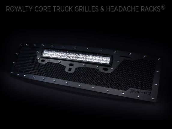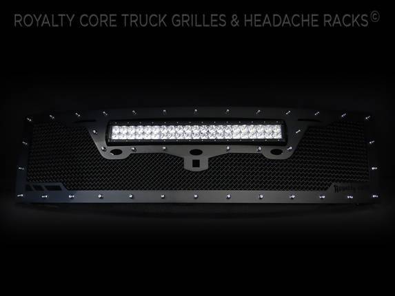 This grille includes an insanely powerful mounted and balanced 23 inch LED light bar.Including a weatherproof Deutsch connector with plug-and-play, polycarbonate lens, and isolated rubber mounts for vibration control. An updated multi-voltelectronicsincrease output with a seamless beam pattern featuring a 50,000 hour lifespan.Being manufactured from extruded 6061 aluminum, this LED is tough enough for all conditions. The front has the ultimate protection of the unbreakable polycarbonate lens. Royalty Core's proprietary corrosion resistant stainless technology creates the most durable grille on the planet. Absolutely every piece is 100% T304 stainless steel. It's engineered to exploit the cleanest installation possible for your specific truck model. This Royalty Core grille is customized to best match your truck with military grade strength you can count on such as a 12 gauge stainless steel construction, optimal mounting brackets, CNC precision machined brackets, frame, and logos, hand fabricated, all gloss surfaces are buffed to a deep smooth mirrored finish,triple chrome plated T304 stainless studs around frame with star flange design, stainless super woven mesh, and absolutely no plastic. Royalty Core offers the industry's largest customized line of grilles and logos available.