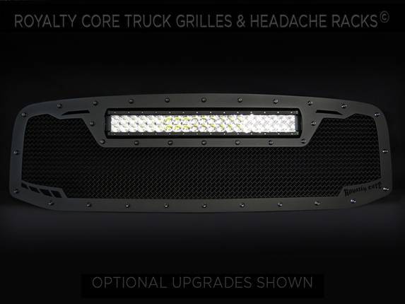 Royalty Core's proprietary corrosion resistant stainless technology creates the most durable grille on the planet. Absolutely every piece is 100% T304 stainless steel. It's engineered to exploit the cleanest installation possible for your specific truck model. This Royalty Core grille is customized to best match your truck with military grade strength you can count on such as a 12 gauge stainless steel construction, optimal mounting brackets, CNC precision machined brackets, frame, and logos, hand fabricated, all gloss surfaces are buffed to a deep smooth mirrored finish,triple chrome plated T304 stainless studs around frame with star flange design, stainless super woven mesh, and absolutely no plastic. Royalty Core offers the industry's largest customized line of grilles and logos available.