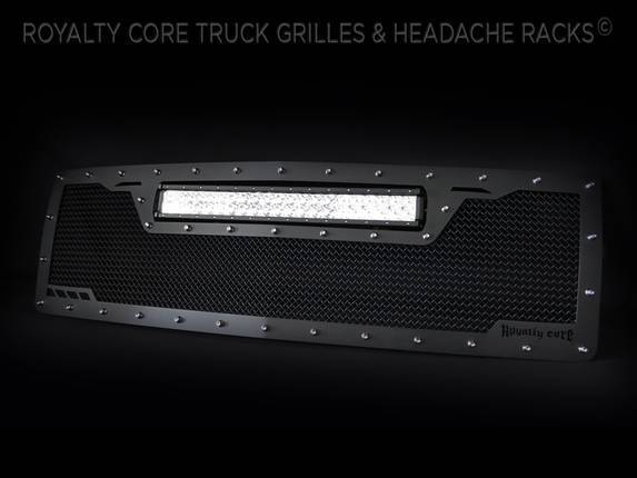 This grille includes an insanely powerful mounted and balanced 23 inch LED light bar.Including a weatherproof Deutsch connector with plug-and-play, polycarbonate lens, and isolated rubber mounts for vibration control. An updated multi-voltelectronicsincrease output with a seamless beam pattern featuring a 50,000 hour lifespan.Being manufactured from extruded 6061 aluminum, this LED is tough enough for all conditions. The front has the ultimate protection of the unbreakable polycarbonate lens. Royalty Core's proprietary corrosion resistant stainless technology creates the most durable grille on the planet. Absolutely every piece is 100% T304 stainless steel. It's engineered to exploit the cleanest installation possible for your specific truck model. This Royalty Core grille is customized to best match your truck with military grade strength you can count on such as a 12 gauge stainless steel construction, optimal mounting brackets, CNC precision machined brackets, frame, and logos, hand fabricated, all gloss surfaces are buffed to a deep smooth mirrored finish,triple chrome plated T304 stainless studs around frame with star flange design, stainless super woven mesh, and absolutely no plastic. Royalty Core offers the industry's largest customized line of grilles and logos available.