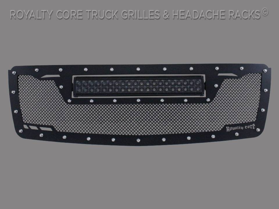 This grille includes an insanely powerful mounted and balanced 23 inch LED light bar.Including a weatherproof Deutsch connector with plug-and-play, polycarbonate lens, and isolated rubber mounts for vibration control. An updated multi-voltelectronicsincrease output with a seamless beam pattern featuring a 50,000 hour lifespan.Being manufactured from extruded 6061 aluminum, this LED is tough enough for all conditions. The front has the ultimate protection of the unbreakable polycarbonate lens. Royalty Core's proprietary corrosion resistant stainless technology creates the most durable grille on the planet. Absolutely every piece is 100% T304 stainless steel. It's engineered to exploit the cleanest installation possible for your specific truck model. This Royalty Core grille is customized to best match your truck with military grade strength you can count on such as a 12 gauge stainless steel construction, optimal mounting brackets, CNC precision machined brackets, frame, and logos, hand fabricated, all gloss surfaces are buffed to a deep smooth mirrored finish,triple chrome plated T304 stainless studs around frame with star flange design, stainless super woven mesh, and absolutely no plastic. Royalty Core offers the industry's largest customized line of grilles and logos available.