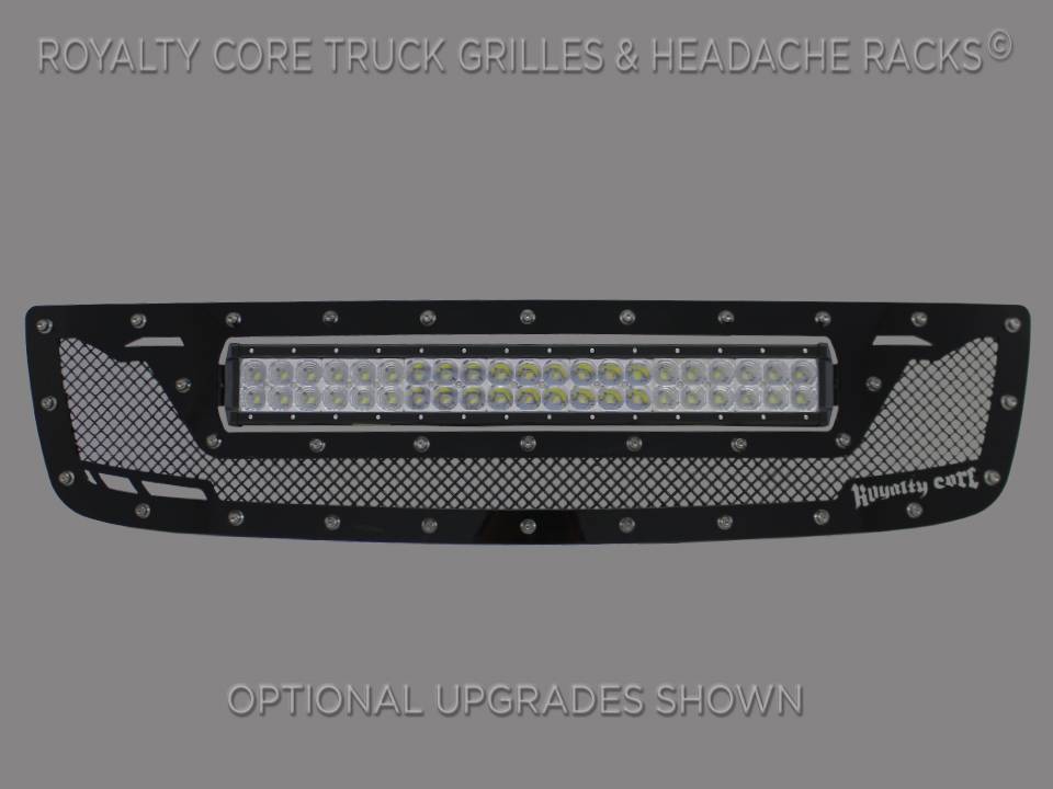 This grille includes an insanely powerful mounted and balanced 23 inch LED light bar.Including a weatherproof Deutsch connector with plug-and-play, polycarbonate lens, and isolated rubber mounts for vibration control. An updated multi-voltelectronicsincrease output with a seamless beam pattern featuring a 50,000 hour lifespan.Being manufactured from extruded 6061 aluminum, this LED is tough enough for all conditions. The front has the ultimate protection of the unbreakable polycarbonate lens. Royalty Core's proprietary corrosion resistant stainless technology creates the most durable grille on the planet. Absolutely every piece is 100% T304 stainless steel. It's engineered to exploit the cleanest installation possible for your specific truck model. This Royalty Core grille is customized to best match your truck with military grade strength you can count on such as a 12 gauge stainless steel construction, optimal mounting brackets, CNC precision machined brackets, frame, and logos, hand fabricated, all gloss surfaces are buffed to a deep smooth mirrored finish,triple chrome plated T304 stainless studs around frame with star flange design, stainless super woven mesh, and absolutely no plastic. Royalty Core offers the industry's largest customized line of grilles and logos available.