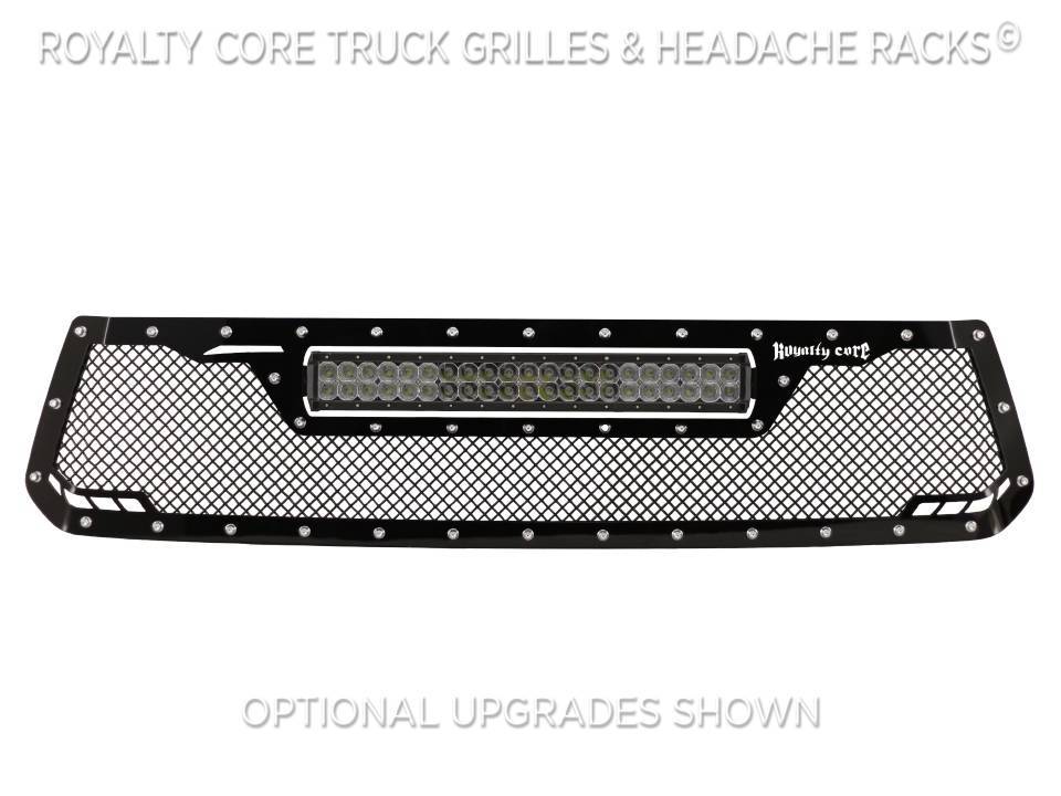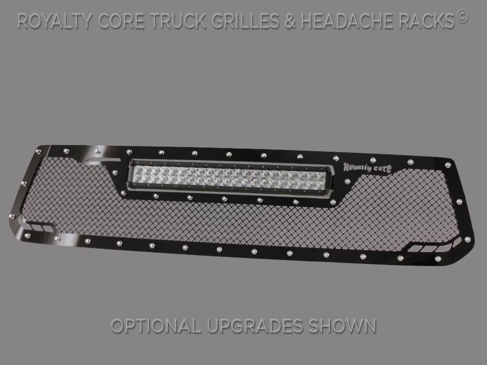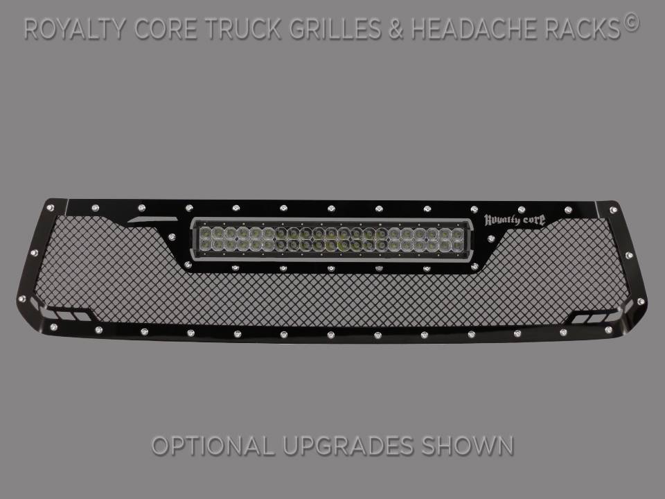 This grille includes an insanely powerful mounted and balanced 22 inch LED light bar.Including a weatherproof Deutsch connector with plug-and-play, polycarbonate lens, and isolated rubber mounts for vibration control. An updated multi-voltelectronicsincrease output with a seamless beam pattern featuring a 50,000 hour lifespan.Being manufactured from extruded 6061 aluminum, this LED is tough enough for all conditions. The front has the ultimate protection of the unbreakable polycarbonate lens. Royalty Core's proprietary corrosion resistant stainless technology creates the most durable grille on the planet. Absolutely every piece is 100% T304 stainless steel. It's engineered to exploit the cleanest installation possible for your specific truck model. This Royalty Core grille is customized to best match your truck with military grade strength you can count on such as a 12 gauge stainless steel construction, optimal mounting brackets, CNC precision machined brackets, frame, and logos, hand fabricated, all gloss surfaces are buffed to a deep smooth mirrored finish,triple chrome plated T304 stainless studs around frame with star flange design, stainless super woven mesh, and absolutely no plastic. Royalty Core offers the industry's largest customized line of grilles and logos available.