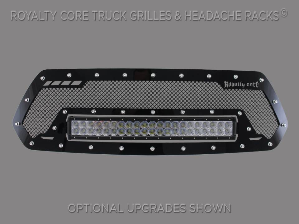 Royalty Core's RCRX LED Race Line Grille cultivates an overall stealth appearance with stainless 12.0 sport mesh surrounded by a studded sleek grille frame with smooth lines. Royalty Core's integrated LED power, Iconic stainless triple chrome studs, T304 construction, and race proven diamond mesh combine one killer RCR design to out-perform andoutlastthe competition.This grille includes an insanely powerful mounted and balanced 20 inch LED light bar.Including a weatherproof Deutsch connector with plug-and-play, polycarbonate lens, and isolated rubber mounts for vibration control. An updated multi-voltelectronicsincrease output with a seamless beam pattern featuring a 50,000 hour lifespan.Being manufactured from extruded 6061 aluminum, this LED is tough enough for all conditions. The front has the ultimate protection of the unbreakable polycarbonate lens.Each grille has been rigorously tested by Royalty Core engineers to maximize protection, appearance, and performance on and off-road. Lab tried with rapid salt and chemical spray tests proving the most resilient grille on the market against the harshest conditions. Simple direct bolt on Royalty Core grilles are engineered to exploit the cleanest installation possible for your specific truck model.Royalty Core's proprietary corrosion resistant stainless technology creates the most durable grille on the planet. Absolutely every piece is 100% T304 stainless steel. It's engineered to exploit the cleanest installation possible for your specific truck model. This Royalty Core grille is customized to best match your truck with military grade strength you can count on such as a 12 gauge stainless steel construction, optimal mounting brackets, CNC precision machined brackets, frame, and logos, hand fabricated, all gloss surfaces are buffed to a deep smooth mirrored finish,triple chrome plated T304 stainless studs around frame with star flange design, stainless super woven mesh, and absolutely no plastic. Royalty Core offers the industry's largest customized line of grilles and logos available.- World Class Quality by Royalty Core Built by Hand in the USA-No Comparison