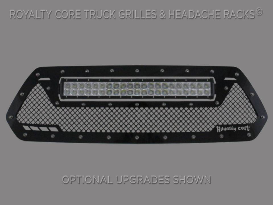 Royalty Core's RCRX LED Race Line Grille cultivates an overall stealth appearance with stainless 12.0 sport mesh surrounded by a studded sleek grille frame with smooth lines. Royalty Core's integrated LED power, Iconic stainless triple chrome studs, T304 construction, and race proven diamond mesh combine one killer RCR design to out-perform andoutlastthe competition.This grille includes an insanely powerful mounted and balanced 20 inch LED light bar.Including a weatherproof Deutsch connector with plug-and-play, polycarbonate lens, and isolated rubber mounts for vibration control. An updated multi-voltelectronicsincrease output with a seamless beam pattern featuring a 50,000 hour lifespan.Being manufactured from extruded 6061 aluminum, this LED is tough enough for all conditions. The front has the ultimate protection of the unbreakable polycarbonate lens.Each grille has been rigorously tested by Royalty Core engineers to maximize protection, appearance, and performance on and off-road. Lab tried with rapid salt and chemical spray tests proving the most resilient grille on the market against the harshest conditions. Simple direct bolt on Royalty Core grilles are engineered to exploit the cleanest installation possible for your specifictruck model.Royalty Core's proprietary corrosion resistant stainless technology creates the most durable grille on the planet. Absolutely every piece is 100% T304 stainless steel. It's engineered to exploit the cleanest installation possible for your specific truck model. This Royalty Core grille is customized to best match your truck with military grade strength you can count on such as a 12 gauge stainless steel construction, optimal mounting brackets, CNC precision machined brackets, frame, and logos, hand fabricated, all gloss surfaces are buffed to a deep smooth mirrored finish,triple chrome plated T304 stainless studs around frame with star flange design, stainless super woven mesh, and absolutely no plastic. Royalty Core offers the industry's largest customized line of grilles and logos available.