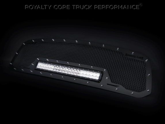 This grille includes an insanely powerful mounted and balanced 23 inch LED light bar.Including a weatherproof Deutsch connector with plug-and-play, polycarbonate lens, and isolated rubber mounts for vibration control. An updated multi-voltelectronicsincrease output with a seamless beam pattern featuring a 50,000 hour lifespan.Being manufactured from extruded 6061 aluminum, this LED is tough enough for all conditions. The front has the ultimate protection of the unbreakable polycarbonate lens. Royalty Core's proprietary corrosion resistant stainless technology creates the most durable grille on the planet. Absolutely every piece is 100% T304 stainless steel. It's engineered to exploit the cleanest installation possible for your specific truck model. This Royalty Core grille is customized to best match your truck with military grade strength you can count on such as a 12 gauge stainless steel construction, optimal mounting brackets, CNC precision machined brackets, frame, and logos, hand fabricated, all gloss surfaces are buffed to a deep smooth mirrored finish,triple chrome plated T304 stainless studs around frame with star flange design, stainless super woven mesh, and absolutely no plastic. Royalty Core offers the industry's largest customized line of grilles and logos available.