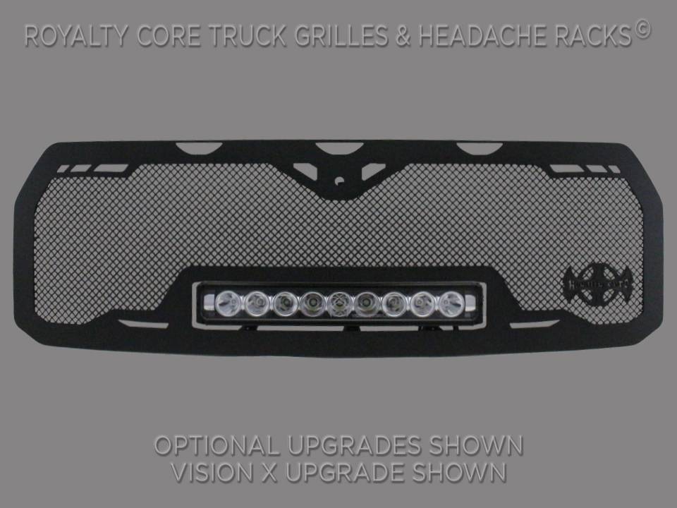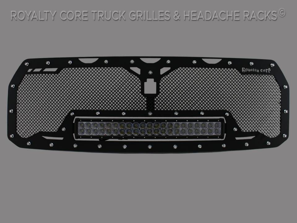 This grille includes an insanely powerful mounted and balanced 23 inch LED light bar.Including a weatherproof Deutsch connector with plug-and-play, polycarbonate lens, and isolated rubber mounts for vibration control. An updated multi-voltelectronicsincrease output with a seamless beam pattern featuring a 50,000 hour lifespan.Being manufactured from extruded 6061 aluminum, this LED is tough enough for all conditions. The front has the ultimate protection of the unbreakable polycarbonate lens. Royalty Core's proprietary corrosion resistant stainless technology creates the most durable grille on the planet. Absolutely every piece is 100% T304 stainless steel. It's engineered to exploit the cleanest installation possible for your specific truck model. This Royalty Core grille is customized to best match your truck with military grade strength you can count on such as a 12 gauge stainless steel construction, optimal mounting brackets, CNC precision machined brackets, frame, and logos, hand fabricated, all gloss surfaces are buffed to a deep smooth mirrored finish,triple chrome plated T304 stainless studs around frame with star flange design, stainless super woven mesh, and absolutely no plastic. Royalty Core offers the industry's largest customized line of grilles and logos available.