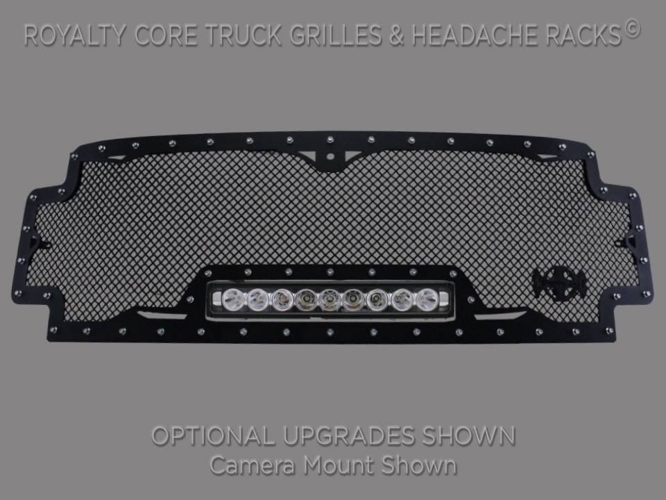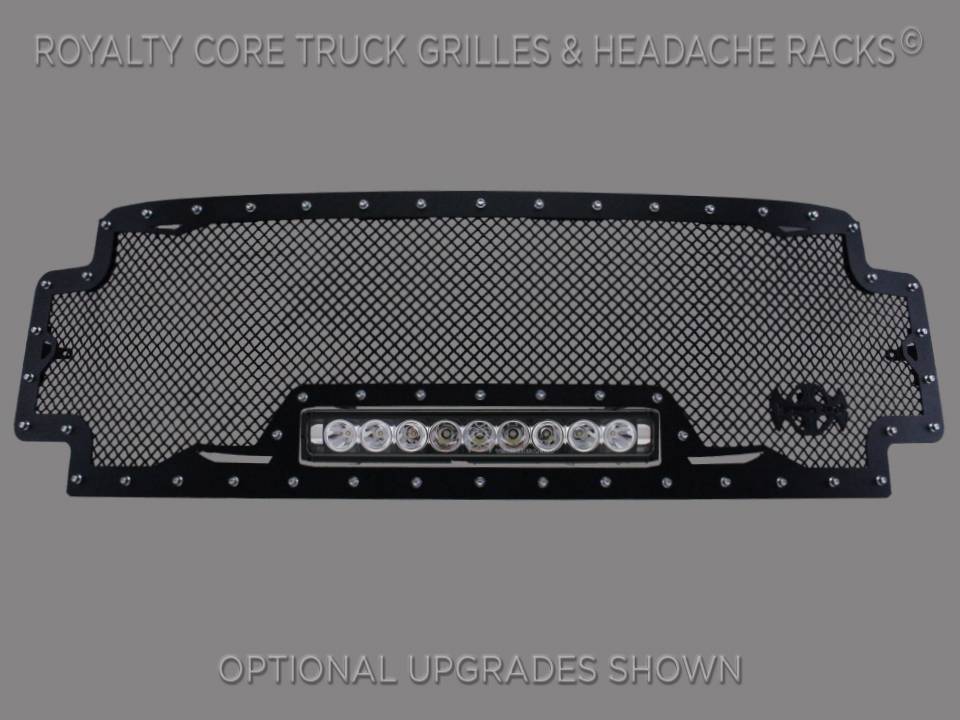 This grille includes a 19 inch Vision X XPR-9M LED light bar.Including a weatherproof Deutsch connector with plug-and-play, polycarbonate lens, and isolated rubber mounts for vibration control. The XPR Series provides a powerful distance that is comparable to HID with all the benefits of the LED featuring a 50,000 hour lifespan.Being manufactured from extruded 6061 aluminum, the LED is tough enough for all conditions. The front has the ultimate protection of the unbreakable polycarbonate lens, while the bottom has the Vision X trunion bracket for mounting.Each grille has been rigorously tested by Royalty Core engineers to maximize protection, appearance, and performance on and off-road. Lab tried with rapid salt and chemical spray tests proving the most resilient grille on the market against the harshest conditions. Simple direct bolt on Royalty Core grilles are engineered to exploit the cleanest installation possible for your specific truck model.Royalty Core's proprietary corrosion resistant stainless technology creates the most durable grille on the planet. Absolutely every piece is 100% T304 stainless steel. It's engineered to exploit the cleanest installation possible for your specific truck model. This Royalty Core grille is customized to best match your truck with military grade strength you can count on such as a 12 gauge stainless steel construction, optimal mounting brackets, CNC precision machined brackets, frame, and logos, hand fabricated, all gloss surfaces are buffed to a deep smooth mirrored finish,triple chrome plated T304 stainless studs around frame with star flange design, stainless super woven mesh, and absolutely no plastic. Royalty Core offers the industry's largest customized line of grilles and logos available.