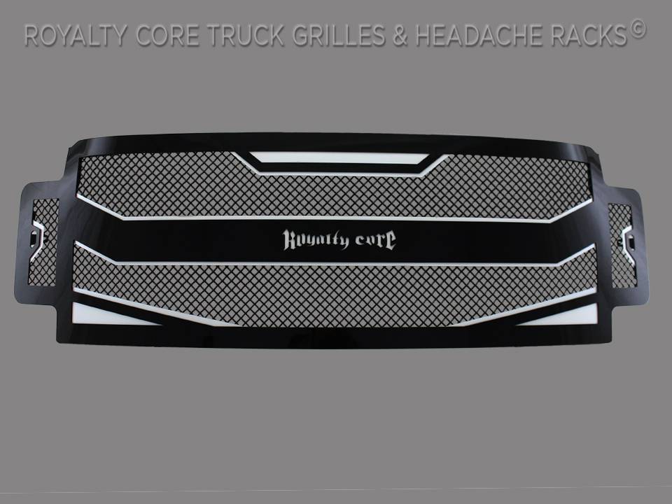 Royalty Core developed the concept of an underlay design originally for a SEMA build. When you come up with something this good-you want to share it. There is a secondary frame which adds detail, color, and dimension. Royalty Core's iconic stainless triplechrome studs, T304 construction, Royalty Core's proprietary corrosion resistant stainless technology creates the most durable grille on the planet.Each grille has been rigorously tested by Royalty Core engineers to maximize protection, appearance, and performance on and off-road. Lab tried with rapid salt and chemical spray tests proving the most resilient grille on the market against the harshest conditions. Simple direct bolt on Royalty Core grilles are engineered to exploit the cleanest installation possible for your specific truck model.Royalty Core's proprietary corrosion resistant stainless technology creates the most durable grille on the planet. Absolutely every piece is 100% T304 stainless steel. It's engineered to exploit the cleanest installation possible for your specific truck model. This Royalty Core grille is customized to best match your truck with military grade strength you can count on such as a 12 gauge stainless steel construction, optimal mounting brackets, CNC precision machined brackets, frame, and logos, hand fabricated, all gloss surfaces are buffed to a deep smooth mirrored finish,triple chrome plated T304 stainless studs around frame with star flange design, stainless super woven mesh, and absolutely no plastic. Royalty Core offers the industry's largest customized line of grilles and logos available.