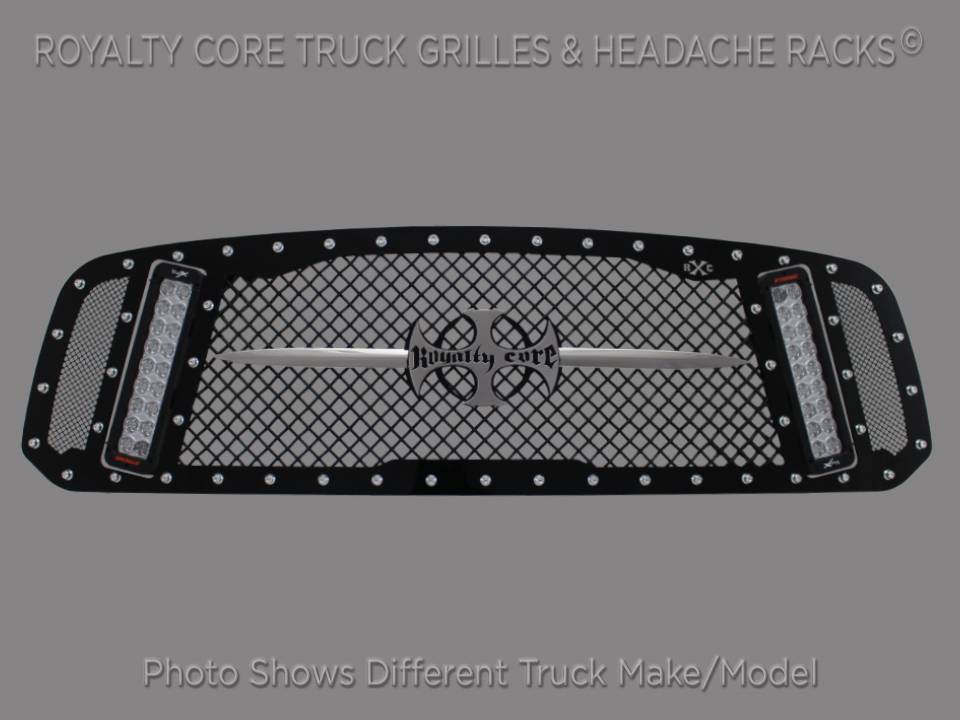 After years of rigorous planning Royalty Core's design team engineered their Explosive RCX grille integrating vertically positioned dual LED light bars with explosive lumen output. Extreme lines, twin mesh accents, and 5.0 Super Woven Mesh create the ultimate grille for your vehicle. This grille includes two insanely powerful Vision X 11.5"" light bars.Includes the all-new VisionX XPL Lo-Pro Light Bar Series with integrated backlit halo. Halo emits a bright & smooth glow around each reflector, perfect as a DRL (Daytime Running Light) or placing on a separate switch/circuit for anytime on-off use. The 2” tall slimline housing integrates perfectly into the grille while the IRIS Reflector technology and 5W LED’s emit amazing amounts of light. IP-67/69K ratedEach grille has been rigorously tested by Royalty Core engineers to maximize protection, appearance, and performance on and off-road. Lab tried with rapid salt and chemical spray tests proving the most resilient grille on