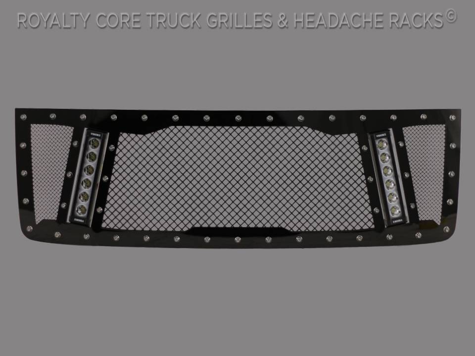 After years of rigorous planning Royalty Core's design team engineered their Explosive RCX grille integrating vertically positioned dual LED light bars with explosive lumen output. Extreme lines, twin mesh accents, and 5.0 Super Woven Mesh create the ultimate grille for your vehicle. This grille includes two insanely powerful Vision X 11.5"" light bars.Includes the all-new VisionX XPL Lo-Pro Light Bar Series with integrated backlit halo. Halo emits a bright & smooth glow around each reflector, perfect as a DRL (Daytime Running Light) or placing on a separate switch/circuit for anytime on-off use. The 2” tall slimline housing integrates perfectly into the grille while the IRIS Reflector technology and 5W LED’s emit amazing amounts of light. IP-67/69K ratedEach grille has been rigorously tested by Royalty Core engineers to maximize protection, appearance, and performance on and off-road. Lab tried with rapid salt and chemical spray tests proving the most resilient grille on