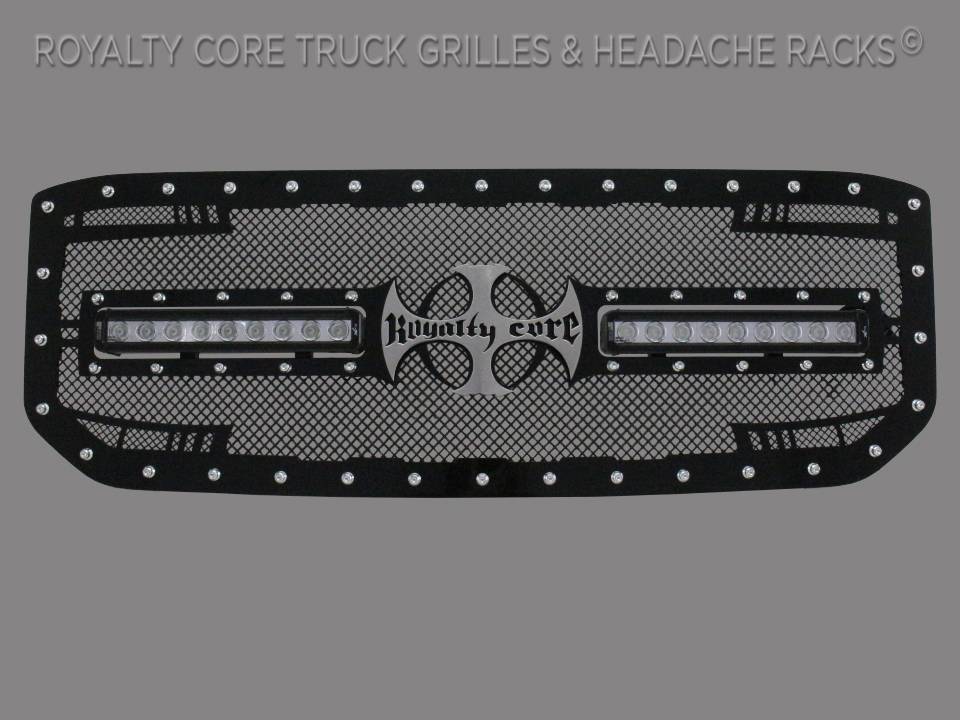 are engineered to exploit the cleanest installation possible for your specifictruck model. Royalty Core's proprietary corrosion resistant stainless technology creates the most durable grille on the planet. Absolutely every piece is 100% T304 stainless steel. It's engineered to exploit the cleanest installation possible for your specific truck model. This Royalty Core grille is customized to best match your truck with military grade strength you can count on such as a 12 gauge stainless steel construction, optimal mounting brackets, CNC precision machined brackets, frame, and logos, hand fabricated, all gloss surfaces are buffed to a deep smooth mirrored finish,triple chrome plated T304 stainless studs around frame with star flange design, stainless super woven mesh, and absolutely no plastic. Royalty Core offers the industry's largest customized line of grilles and logos available.