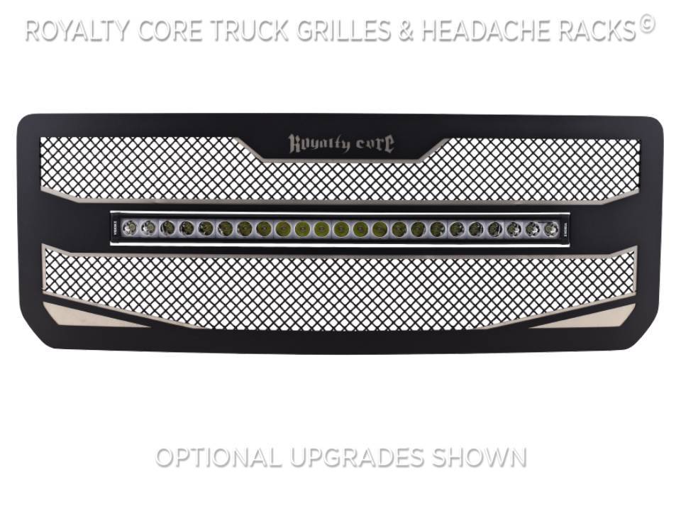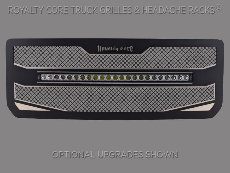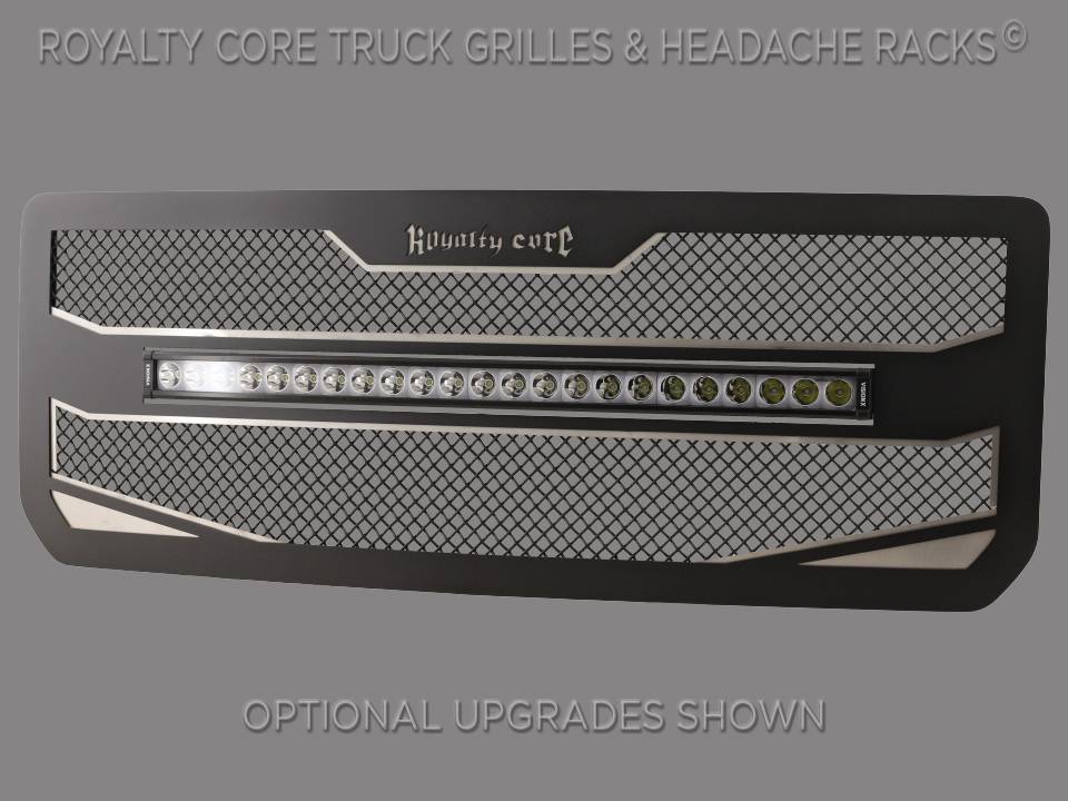 Royalty Core developed the concept of an underlay design originally for a SEMA build. When you come up with something this good-you want to share it. There is a secondary frame which adds detail, color, and dimension. Royalty Core's iconic stainless triple chrome studs, T304 construction, Royalty Core's proprietary corrosion resistant stainless technology creates the most durable grille on the planet. This Grille includes VisionX XPL 30” Curved LED bar for superior fit to the curvature of the grille. This slim-line bar is made with extremely bright 5 watt CREE LED’s and Iris Reflector Technology for long distance projection and superior slim-line bar performance. The XPL 30 Curved includes a Backlit Halo that is SAE compliant and street legal for Daytime Running Lights. You can now legally use your LED bar on-road!Each grille has been rigorously tested by Royalty Core engineers to maximize protection, appearance, and performance on and off-road. Lab tried with rapid salt and chemical spray tests proving the most resilient grille on the market against the harshest conditions. Simple direct bolt on Royalty Core grilles are engineered to exploit the cleanest installation possible for your specific truck model.Royalty Core's proprietary corrosion resistant stainless technology creates the most durable grille on the planet. Absolutely every piece is 100% T304 stainless steel. It's engineered to exploit the cleanest installation possible for your specific truck model. This Royalty Core grille is customized to best match your truck with military grade strength you can count on such as a 12 gauge stainless steel construction, optimal mounting brackets, CNC precision machined brackets, frame, and logos, hand fabricated, all gloss surfaces are buffed to a deep smooth mirrored finish,triple chrome plated T304 stainless studs around frame with star flange design, stainless super woven mesh, and absolutely no plastic. Royalty Core offers the industry's largest customized line of grilles and logos available.- World Class Quality by Royalty Core Built by Hand in the USA-No Comparison