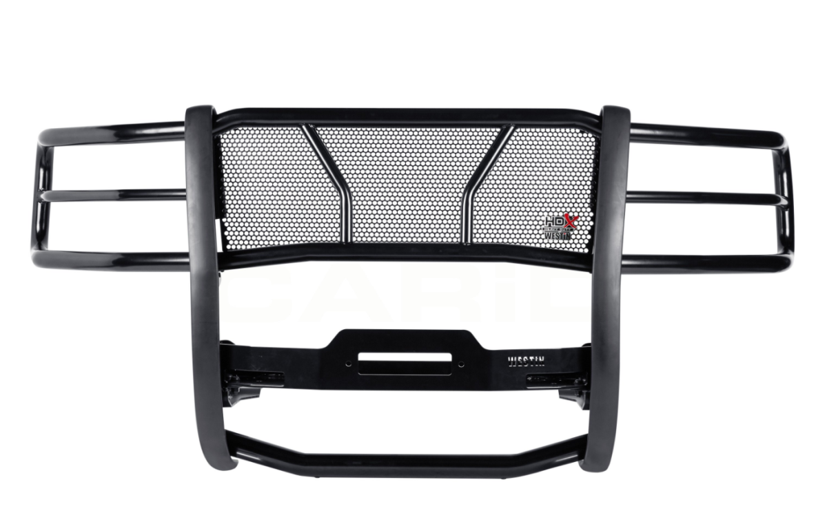 HDX Black Powder Coat Winch Mount Grille Guard (57-93975) by Westin. Material: Mild Steel. Westin's HDX winch Mount Grille Guard is Xtreme Truck Gear for truck enthusiasts seeking additional functionality. It not only offers all features of an HDX Grille Guard, but also provides the ability to hold a winch up to 10.25-inches tall with ratings up to 12,000 lbs. winch trays are tested and capability-confirmed to a minimum straight line pull of 16,500 pounds.