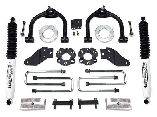 Tuff Country Uni-Ball lift kit for the Nissan Titan XD will allow for use of up to 35" tires (with major trimming) and gives additional fender clearance. This 4 inch lift kit uses upper control arms w/uni-ball joints for greater suspension travel, extreme durabilty and elimination of binding that regular ball joints can cause. The rear is lifted using 2 inch lift block and extended ubolts. Installation is straight forward with no holes to drill. Tuff Country has been producing quality suspension products for over 25 years and backs all lift kits with a limited lifetime warranty. Includes rear SX8000 shocks.