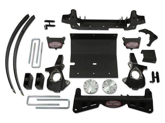 Tuff Country EZ-Ride Suspension new "Strong" suspension lift kits use new extended steering knuckles and a three-piece sub frame that includes two cross members that are connected by a heavy duty skid plate. This skid plate is designed to protect the front differential and stabilize the cross members for unmatched strength and durability. This design also allows for an easier and quicker installation. 3" cast iron blocks along with rear add-a-leafs lift the rear to level the GMC Sierra. Differential drop brackets and torsion bar drop brackets keep everything in alignment. Tuff Country has been producing quality suspension products for over 25 years and backs all lift kits with a limited lifetime warranty.