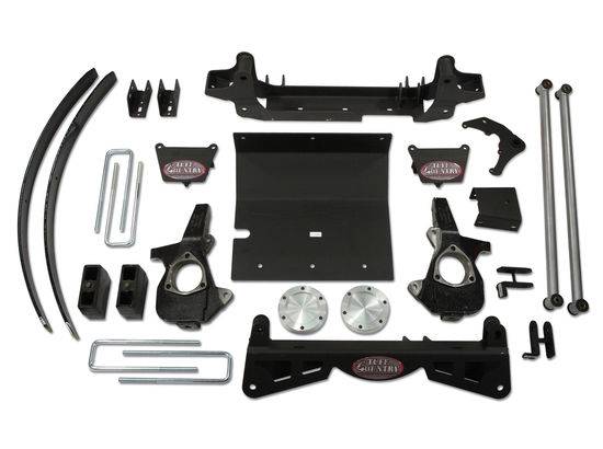 Tuff Country EZ-Ride Suspension new "Strong" suspension lift kits use new extended steering knuckles and a three-piece sub frame that includes two cross members that are connected by a heavy duty skid plate. This skid plate is designed to protect the front differential and stabilize the cross members for unmatched strength and durability. This design also allows for an easier and quicker installation. 4" cast iron blocks along with rear add-a-leafs lift the rear to level the GMC Sierra. Differential drop brackets and torsion bar drop brackets keep everything in alignment. Also included are lateral compression arms which along with the 3-piece sub frame strengthen and stabilize the front end.