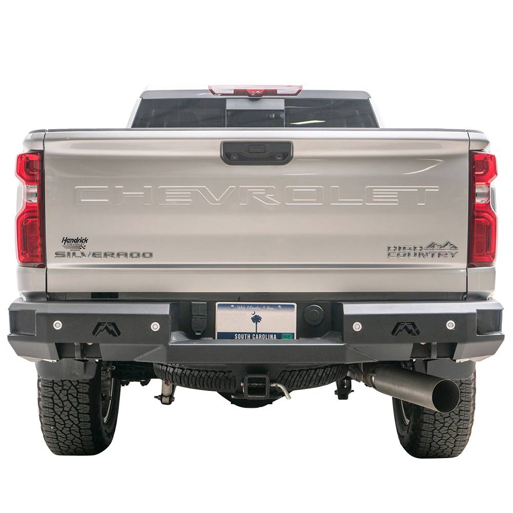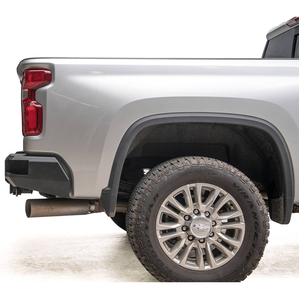 Fab Fours Chevy HD rear replacement bumper integrates the existing receiver hitch. In addition to added style and formed-steel durability, the vehicle gains lower steps and recovery points. Designed to be the ultimate in functionally-stylish rear-end protection.