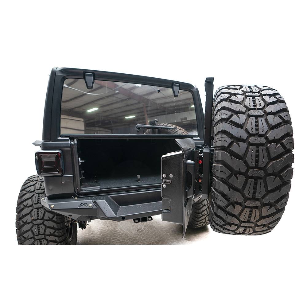 The Fab Fours JL tire carrier adds superior strength, utility, and 100% function of your back-up camera with the help of our new injection molded camera shroud. This off-the-door tire carrier is the first ever "5-point system" for the JL, allowing ease of opening and shutting while running up to a 40" tire.