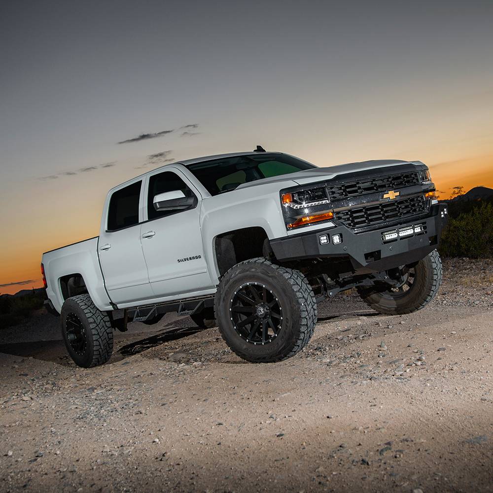 Give your Silverado 1500 an aggressive style and stance with this Alumilite bumper. This bumper fits four square 3" cube LED's, like the Baja designs squadrons and a 20" LED light bar, like the Baja designs S8, fits under the included bolt-on RT light mount. It can also fit an additional 20" LED light bar or 3" cube lights in the center vents. This bumper fits with and without front parking sensors and OE tow hooks. If you have a lifted Silverado and have upgraded your tire size, there’s a good chance that you had to trim the front bumper to keep the tires from rubbing. This bumper eliminates that issue entirely by giving you all the clearance you could ever need. As an added bonus, this low-weight bumper (compared to the steel counterpart) will help those wheel bearings live longer!