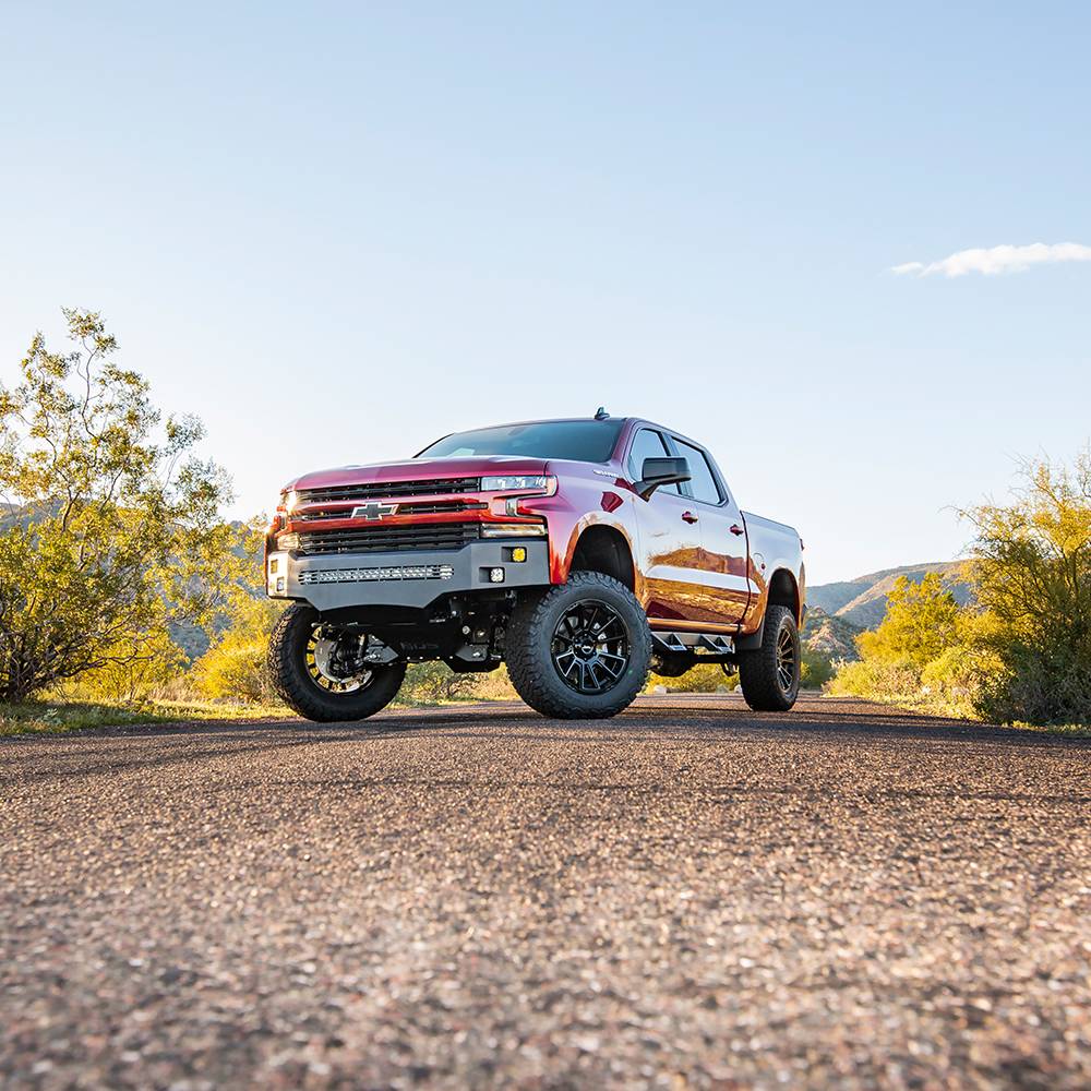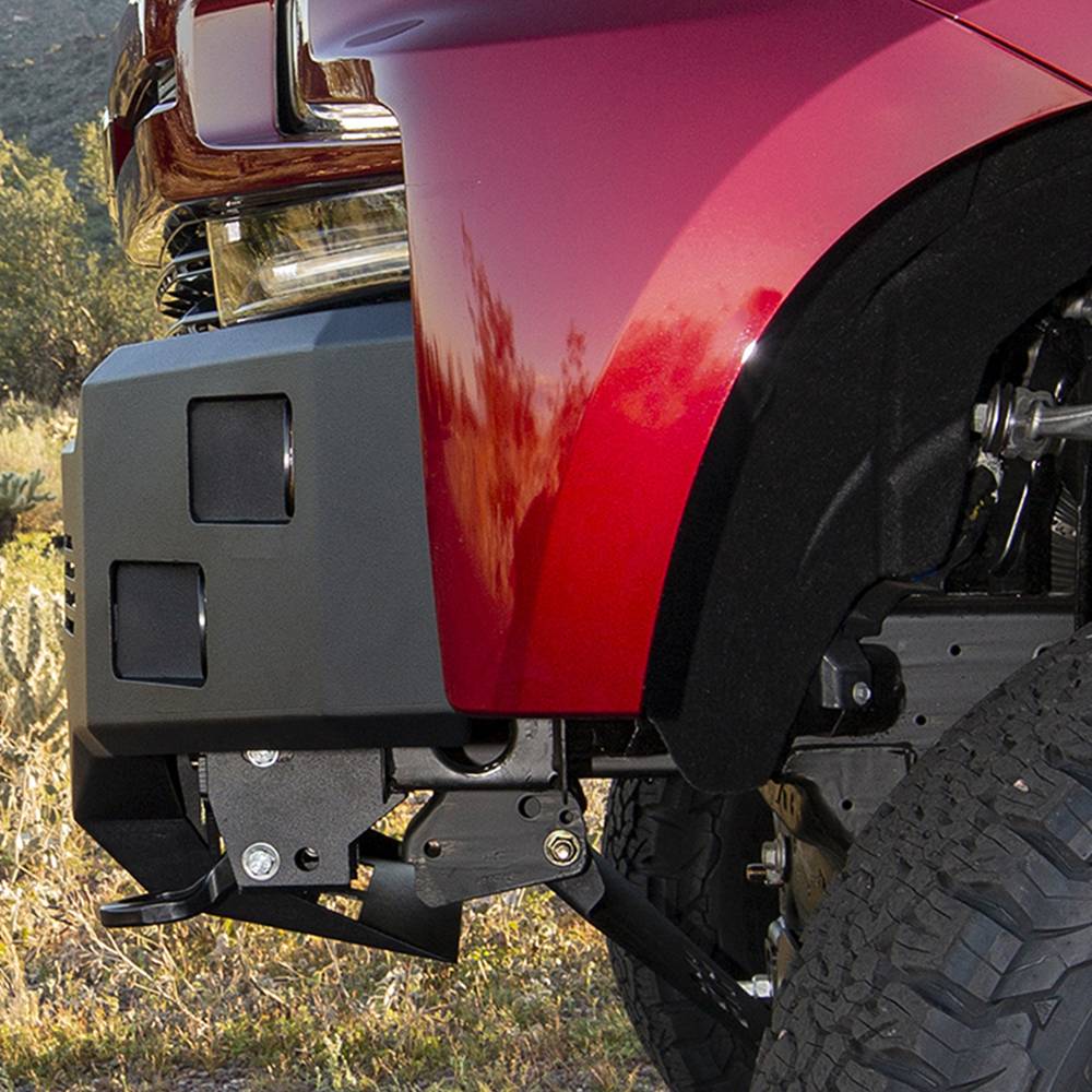 Give your Silverado 1500 a more aggressive style and stance with this Alumilite bumper. This bumper can fit four square 3" cube LED’s, like the Baja designs squadron, and a 40" curved LED light bar, like the Baja designs OnX6, or a plethora of 3" cubes in the center opening. It fits with and without front parking sensors as well as OE tow hooks. The lower lip of the bumper extends back an additional 13" for lower skid-area protection. You will not be disappointed with this bumper!