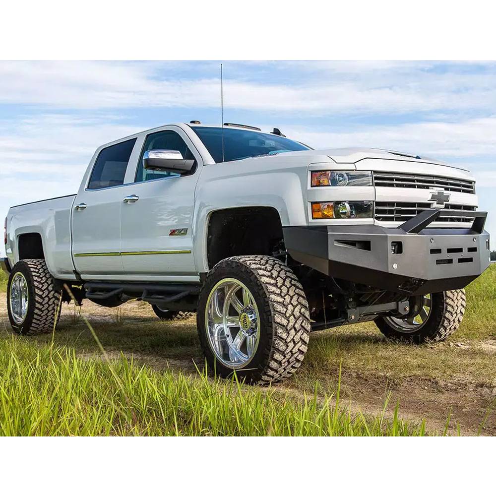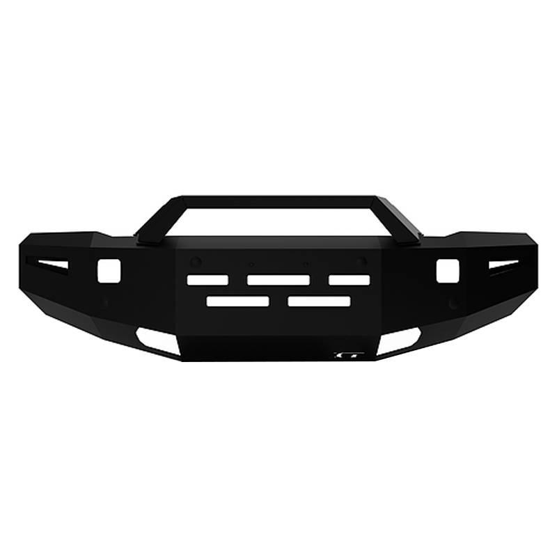 Add some options and style to the front of your Silverado HD with this Alumilite bumper! This bumper can fit two square 3" cube LED’s, like the Baja designs squadron, and a 20" LED light bar, like the Baja designs S8, fits under the included bolt-on RT light mount. This bumper fits with or without front parking sensors and OE tow hooks. The added clearance means no necessity to trim your front bumper to clear bigger tires and you won’t have to turn up your torsion bars to compensate for the weight of this bumper.