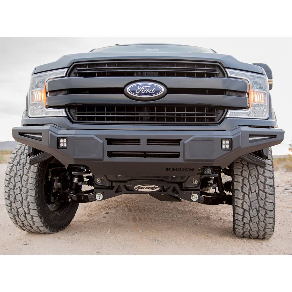 Compliment your aluminum-bodied Ford F150 with this Alumilite bumper. This bumper can fit 2-4 (depending if you have adaptive cruise sensor) square 3" cube LED’s, like the Baja designs squadron, and a 20" LED light bar, like the Baja designs S8, fits under the included bolt-on RT light mount. There is no frame cutting required to install this bumper and the adaptive cruise control sensor, if present, bolts directly to the bumper and keeps it in the factory location. No need to relocate it or worry about it malfunctioning. The RT Light Mount is bolt-on, so if you do have the front facing camera in the grille, you may want to leave off the RT Light Mount as it will be visible in the camera.