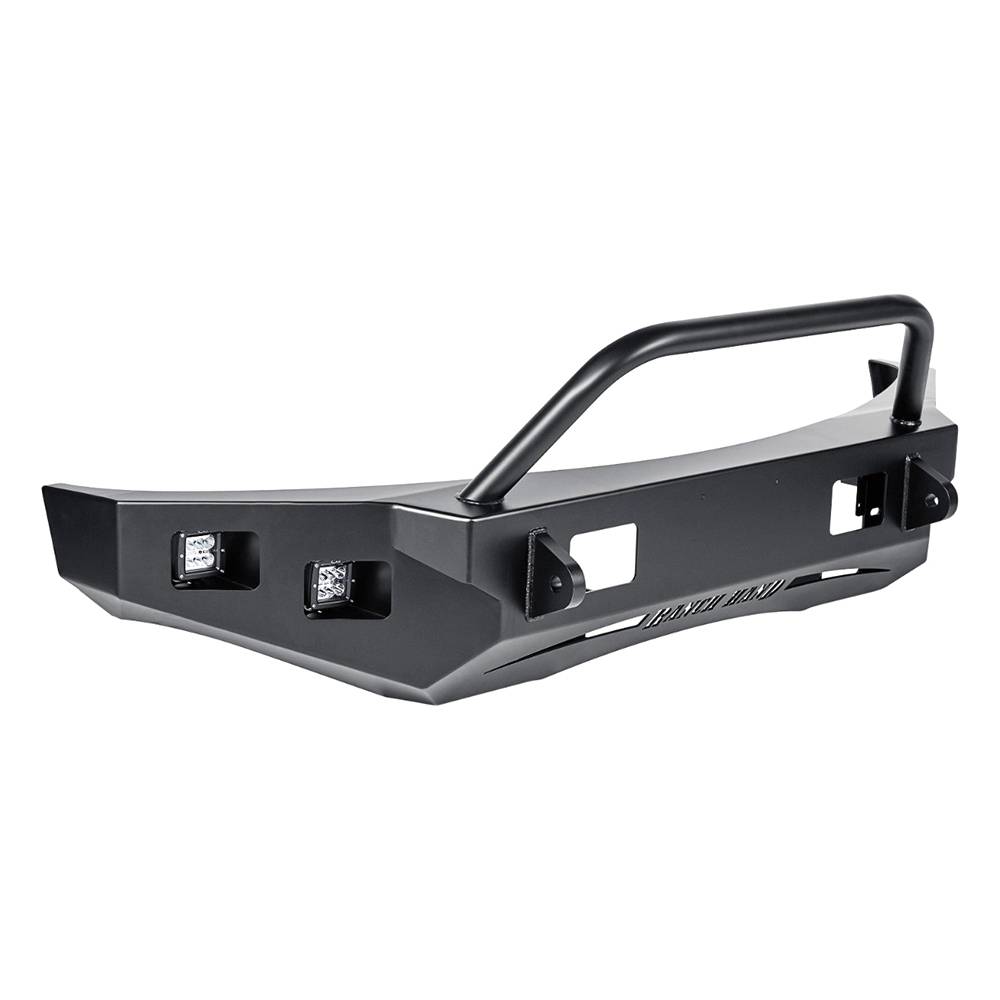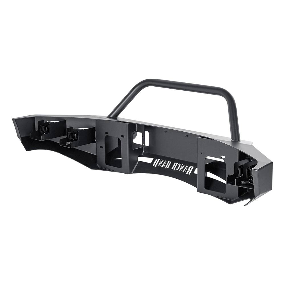 The horizon front bumper is Ranch Hand smooth metal series. Composed of 7-gauge steel with matte black finish the horizon series remains true to Ranch Hand reputation for durability and strength. The sleek contoured design conforms perfectly to a trucks profile replacing the factory bumper with power and style. LED floodlights and spotlights are standard. A optional 2" 12-gauge bull nose is optional.