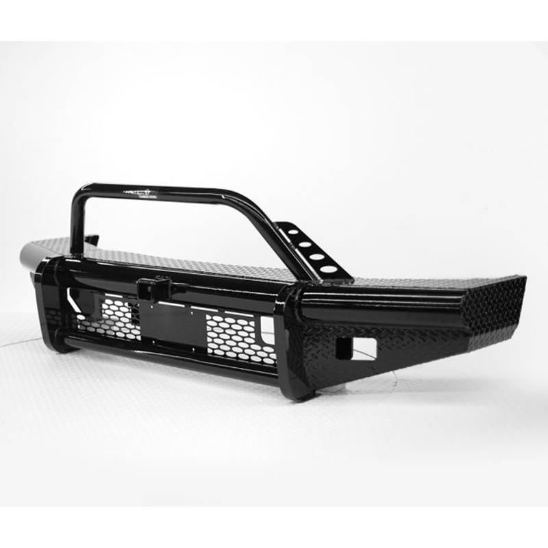 The legend series front bumper is the strongest product represented in vehicle protection built for 3/4 ton and bigger trucks. Identified as Ranch Hand workhorse steel bumper, its constructed from 4" schedule 40 pipe and diamond-plate steel. The built in grille guard provides maximum protection to the headlights and all around unyielding front end protection.