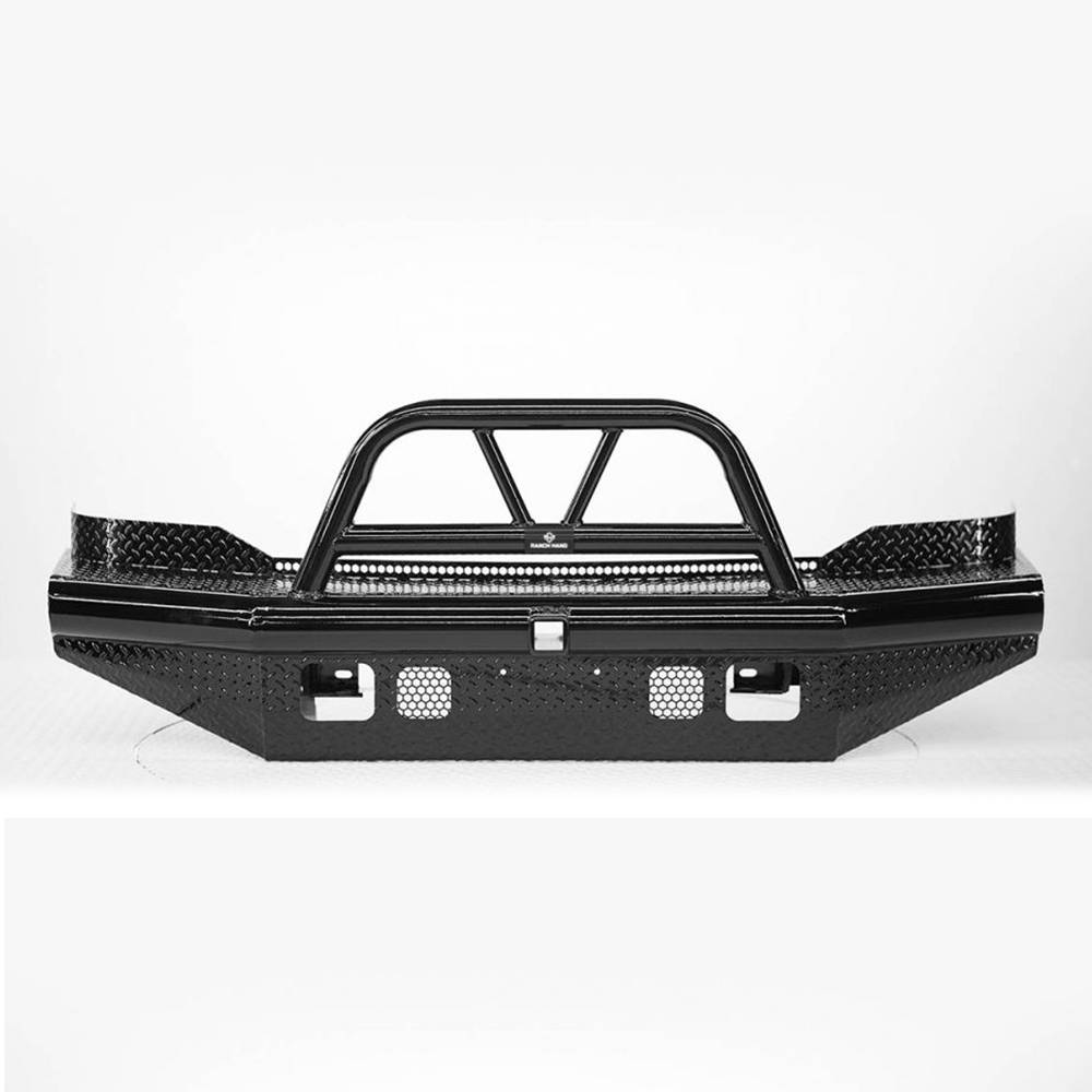 The legend series front bumper is the strongest product represented in vehicle protection built for 3/4 ton and bigger truck. Identified as Ranch Hand workhorse steel bumper its constructed from 4" schedule 40 pipe and diamond-plate steel. The built in grille guard or bullnose provides maximum protection to the headlights and all around unyielding front end protection.