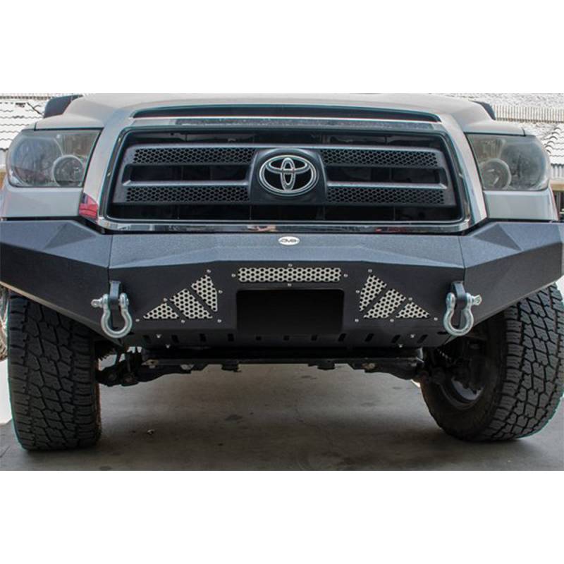 It features recovery shackles and can accommodate up to a 12,500 lbs winch. The bumper flows with the body lines of the Tundra perfectly and adds protection to your front end. It is made out of 3/16 inch cold rolled steel with inch reinforcement where necessary and has aluminum mesh to allow cold air to permeate the bumper and flow properly to your trucks OEM components.
