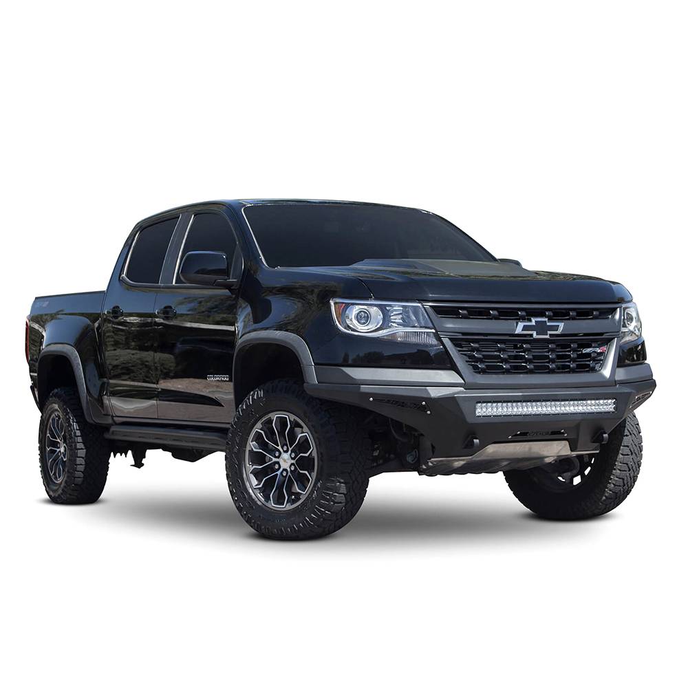 With the stealth fighter front bumper, your Chevy Colorado vehicle will never be looking better. Featuring a radius steel plate, your Chevy truck will include added front end protection without unnecessary bulk. This front bumper for your Chevy Colorado matches the Colorado ZR2 body lines and has a tight fitting steel plate bumper to compliment the ZR2 look. The light mount system is patented universal and allows for mounting up to 8 cube lights or a 30" radius LED. You can mount any combination of style light, size, or brand to give your vehicle's front bumper the extra lighting that it needs. D-Ring mounts offer your truck additional utility to maneuver through any tough situation. It also comes packaged with a universal light mount kit to install any size and brand lighting combination.