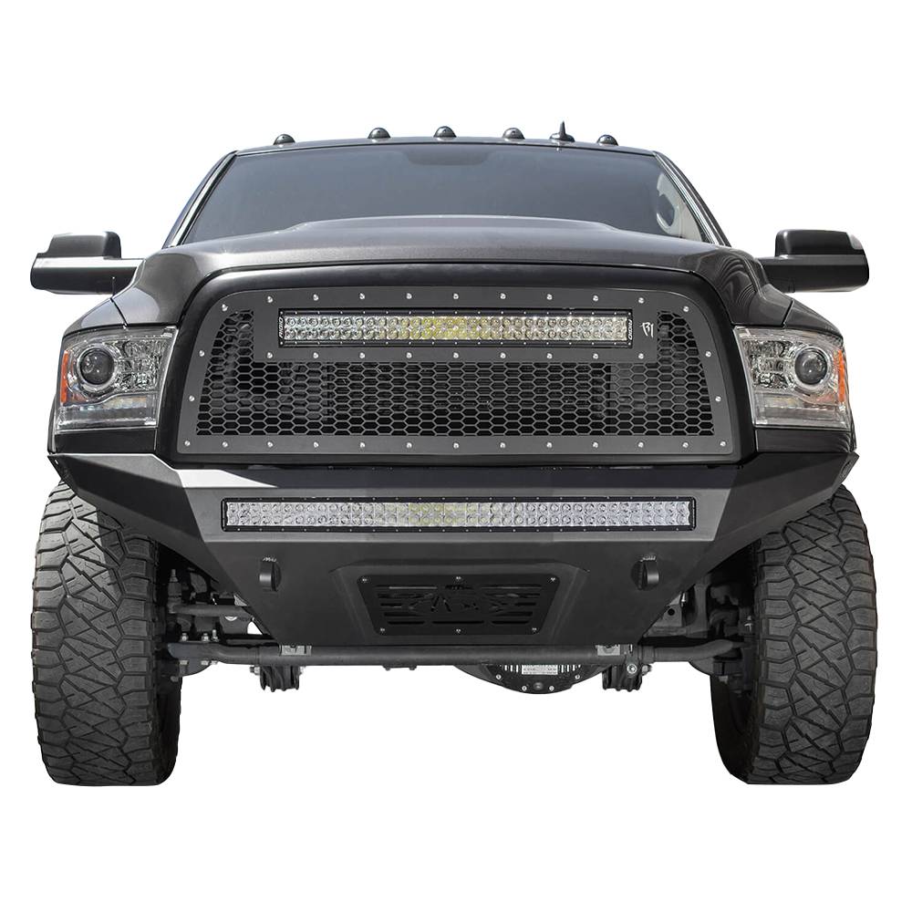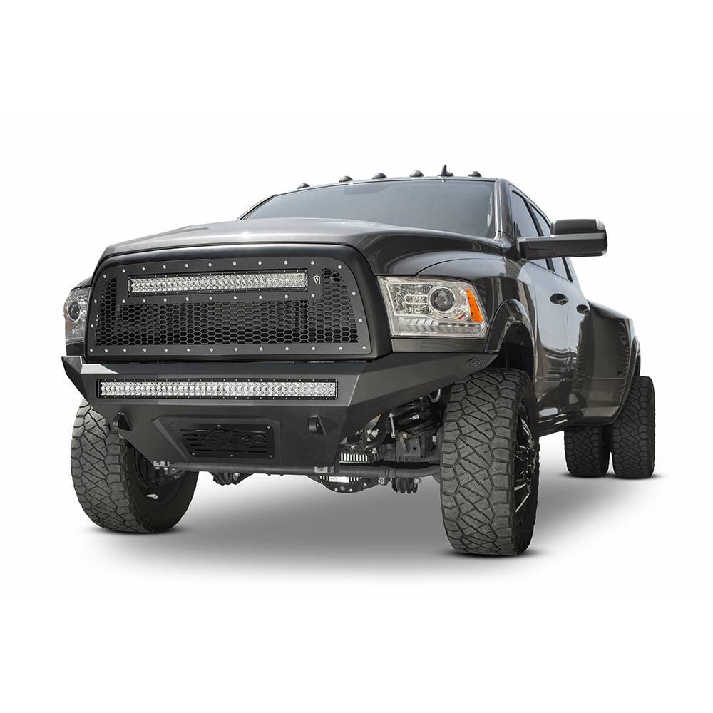 The dodge ram 2500/3500 has never looked better with the stealth fighter front bumper. A radius steel plate design gives your ram truck added front end protection without all the extra bulk. Matching the ram 2500/3500 factory body lines, the stealth fighter front bumper is a tight fitting steel plate bumper that compliments the rams look. Patented universal light mount system allows mounting up to a 40" radius LED or 10 cube lights. Mount any combination of brand, size and style light to give your dodge ram front bumper the added lighting that you need. Fully bolt-on means that there is no cutting or welding required to install the stealth fighter front bumper. Reinforced D-ring mounts provide your truck with added utility to pull through any tough situation. Comes packaged with universal light mount Kit to install any brand and size lighting combination.