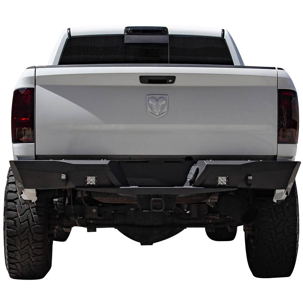 Upgrade your dodge ram 2500/3500 rear bumper with the stealth fighter steel plate bumper. The unique styling transforms the look of your truck while retaining the utility of your factory tow hitch and trailer plug. Two rear facing cube light mounts provide your ram with additional lighting and optional backup sensor cutouts retain your truck's utility. D-Ring mounts have been reinforced so your truck isn't left stranded in a crucial situation. Fully bolt-on ram bumper means that no cutting or welding is required for installation.