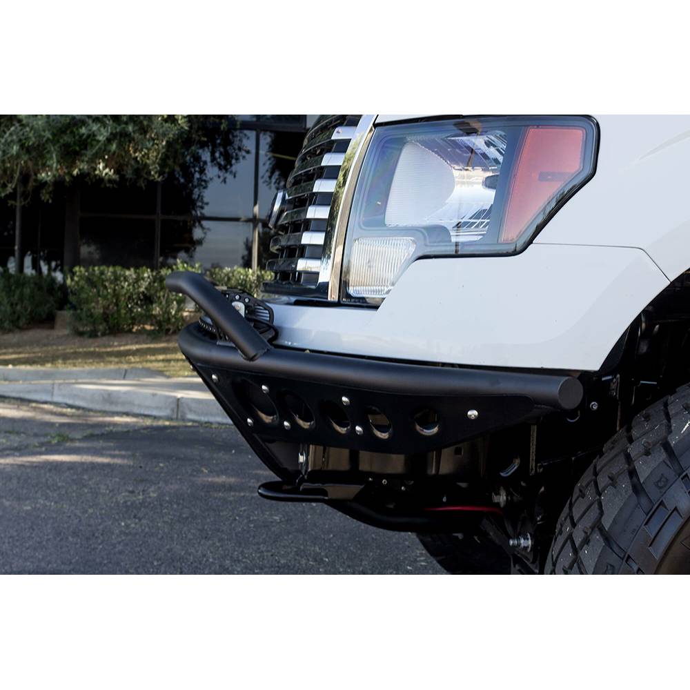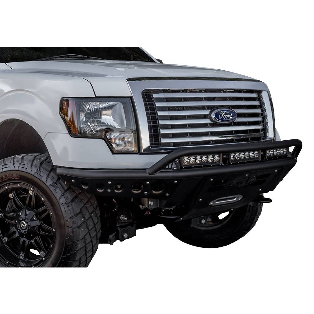The stealth R front bumper for Ford F150 takes our stealth style bumper and slims it down with radius tubing. Built with .120 wall steel tubing and 1/8" aluminium accent panels and skid plate, the Stealth R for the Ford F150 is built to withstand off-road adventures. A universal light mount system inside the top hoop allows up to 10 cube lights or a single 40" radius LED bar to be installed, to give your truck extra lighting for night expeditions. Mix and match any size and brand light to create multiple lighting combinations to best suit your off-road needs. Comes packaged with our universal light mount Kit to install any brand and size lighting combination.