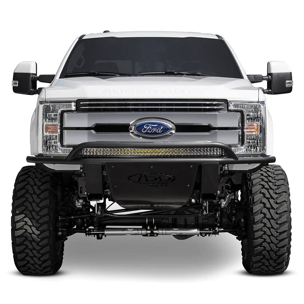 From the deserts of the southwest to the muddy back roads of the midwest, the ADD lite front bumper offers not only aggressive styling, but also functionality. With its low profile skid plate and tight front fitment, the ADD lite gives you a higher approach angle and more front end clearance. We even give you the option of a top hoop to protect your lighting. The ADD lite will turn heads without breaking the bank. It comes at our most competitive price point, but delivers the exceptional quality that comes standard on all of our products. This is a proud addition to our line of Ford Super Duty aftermarket truck accessories. The ADD lite comes standard with our new universal light mounting system, which allows you to mount several brands of lights in a variety of combinations. The ADD lite Ford Super Duty front bumper also comes with our hammer black powder coat and satin black panels. A perfect face lift for your Ford F250/F350 truck. Every ADD offroad product is hand crafted in America from American materials and guaranteed to impress.