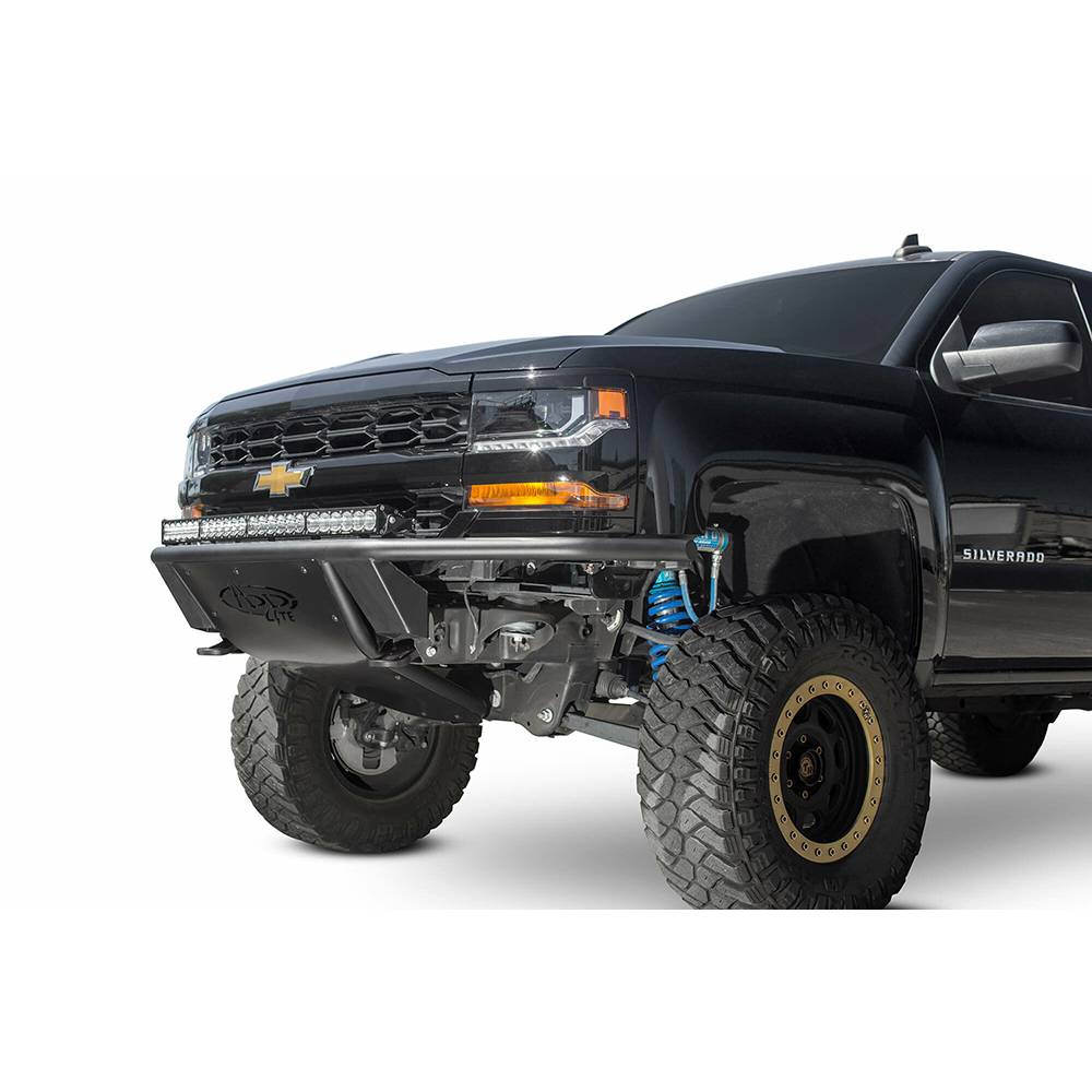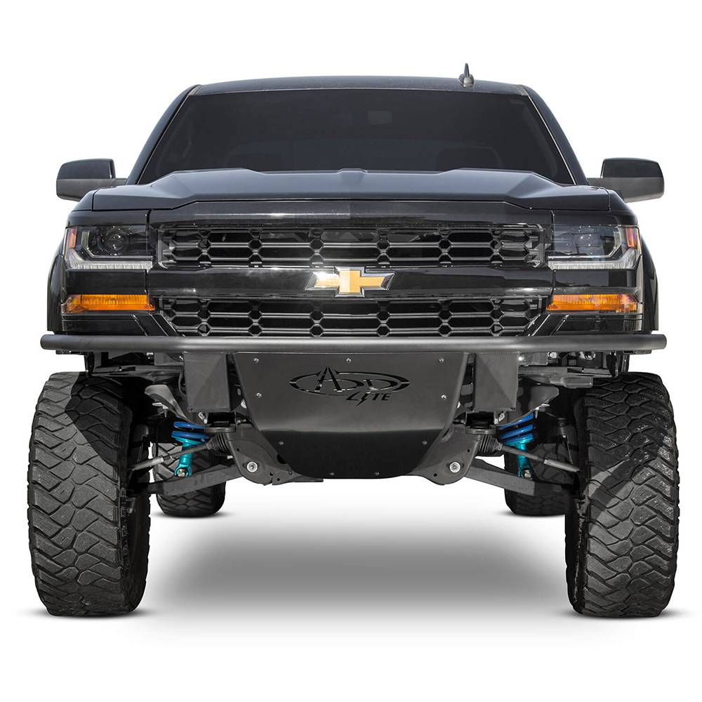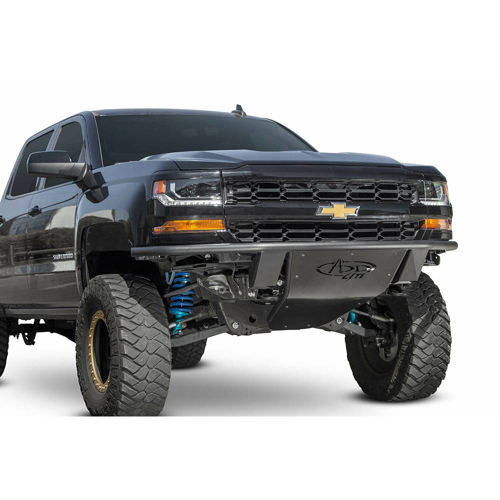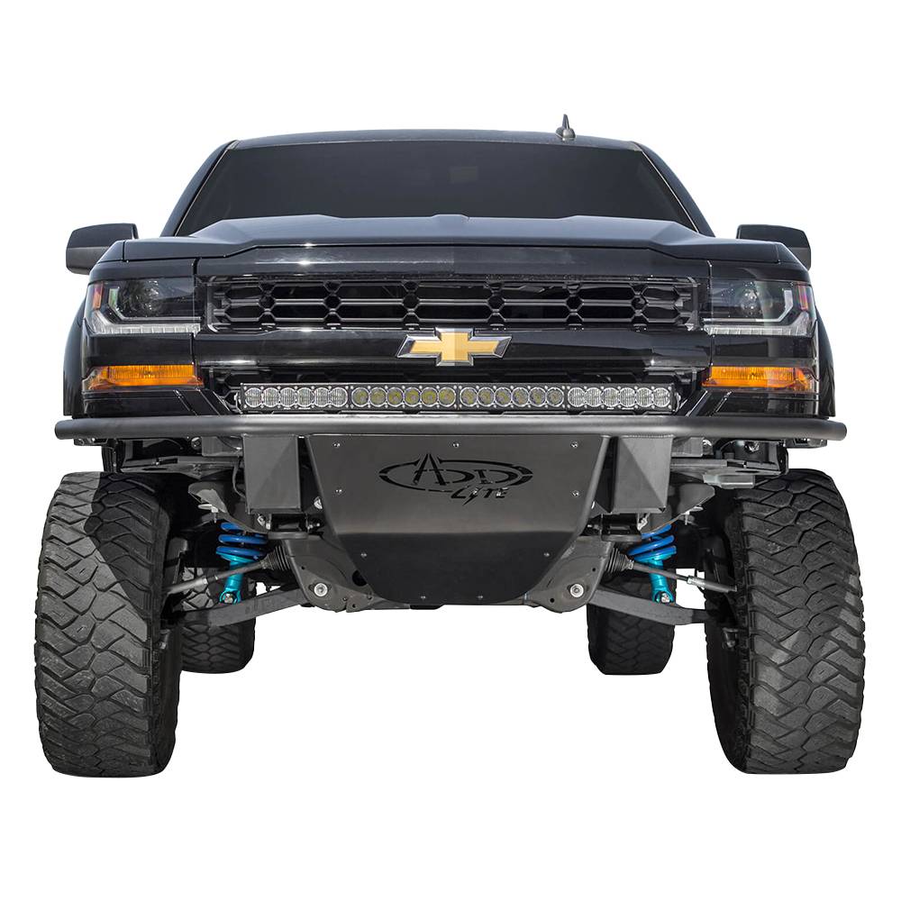 The deserts of the southwest to the muddy back roads of the midwest, the ADD lite front bumper offers not only aggressive styling, but also functionality. With its low profile skid plate and tight front fitment, the ADD lite gives you a higher approach angle and more front end clearance for your Chevy Silverado 1500. We even give you the option of a top hoop to protect your lighting. The ADD Lite will turn heads without breaking the bank. It comes at most competitive price point, but delivers the exceptional quality that comes standard on all of products. This is a proud addition to line of Chevy 1500 aftermarket truck accessories. The Silverado 1500 ADD lite comes standard with new universal light mounting system, which allows you to mount several brands of lights in a variety of combinations. The ADD Lite for the Chevy 1500 front bumper also comes with hammer black powder coat and satin black panels. A perfect facelift for your Chevy Silverado truck. Every ADD offroad product is handcrafted in the USA from American materials and guaranteed to impress as you drive by. Comes packaged with universal light mount kit to install any brand and size lighting combination.