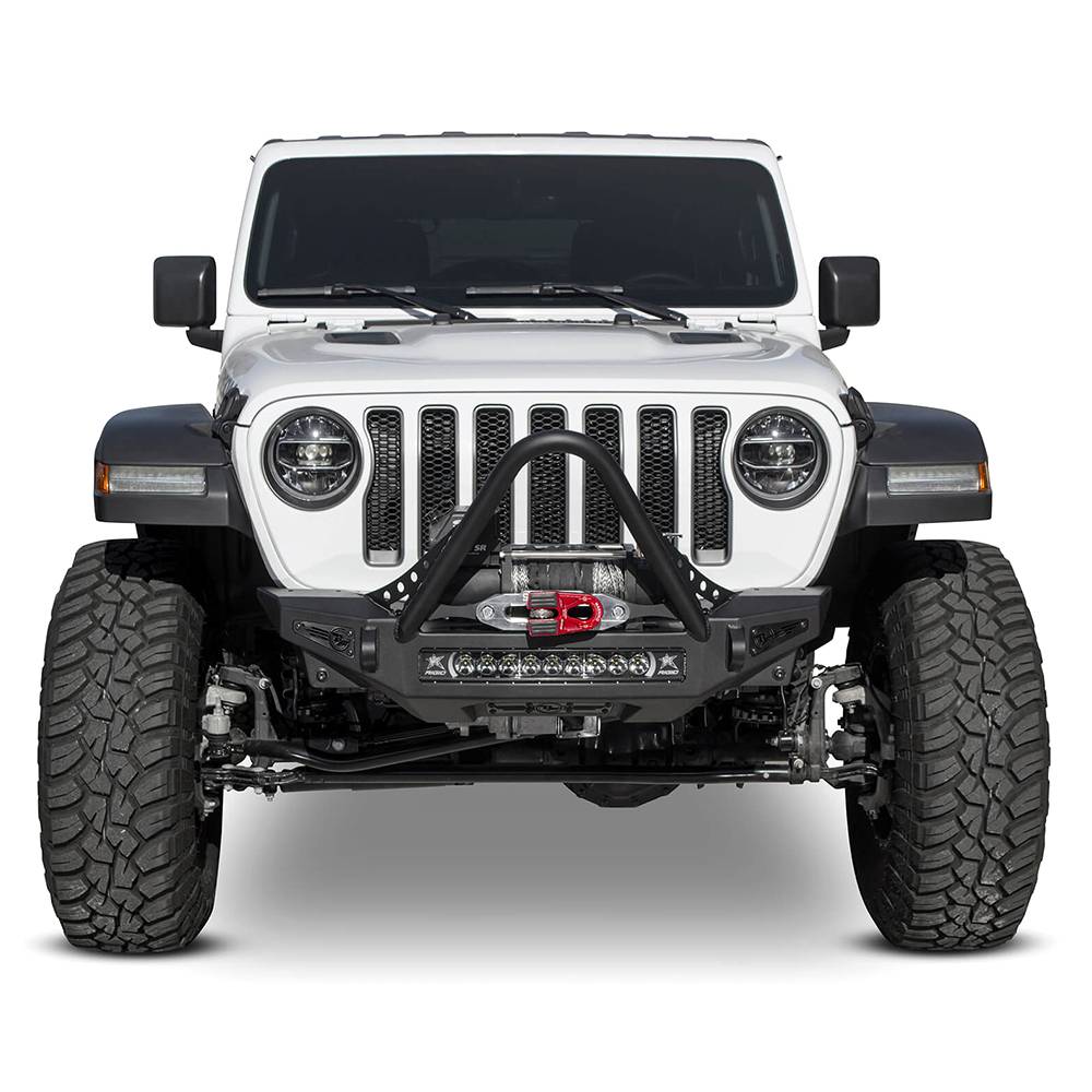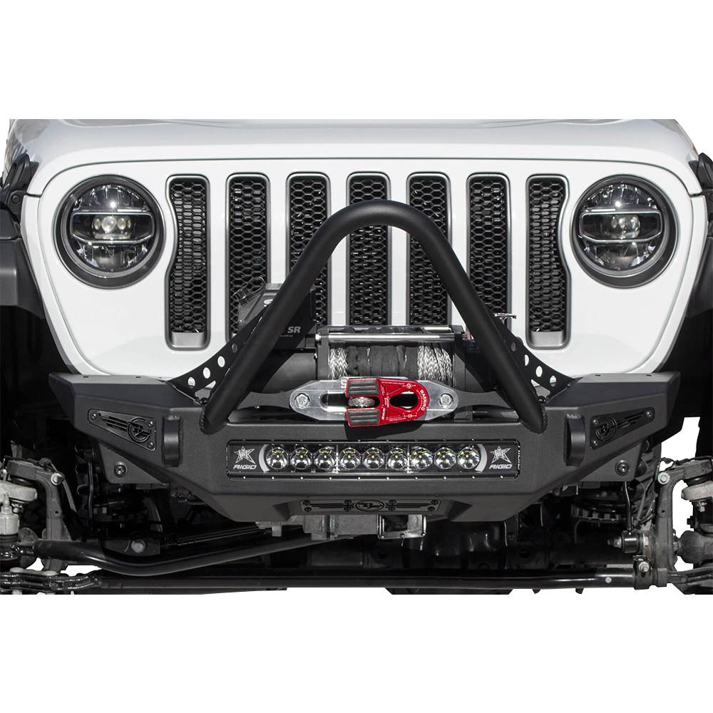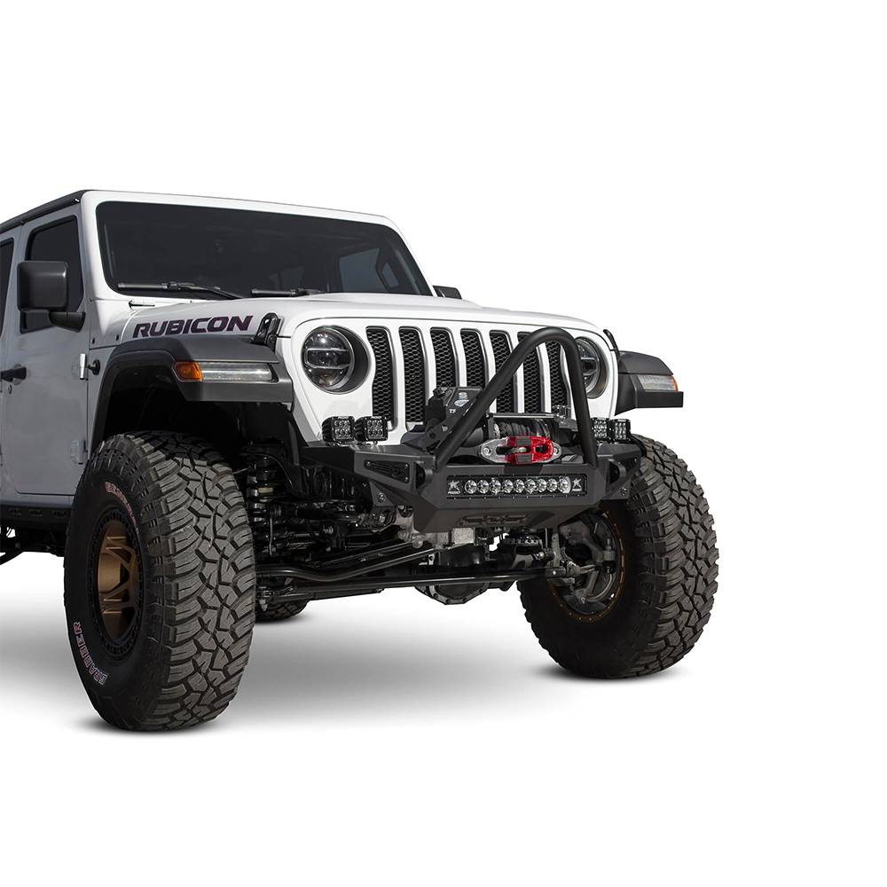 Give your jeep wrangler JL or jeep gladiator JT a transformed look with stinger front bumper for the jeep JL/JT. The stinger winch front bumper looks good with any aftermarket fenders you put on your wrangler or gladiator with greater approach angle to maximize offroad performance and two different style hoop options for front end protection, the rock fighter front bumper for the jeep JL/JT gives your jeep style and functionality. A patented universal light mount system in the center of the bumper allows mounting of any brand and size of light up to a 20" radius light bar or up to 5 cube lights. Additional lighting can be added to the top corners of the rock fighter bumper with mounts for 2 cube lights per side. Two clevis mounts on the front of the rock fighter front bumper accept a 3/4" D-ring and are reinforced to help out in tough situations.