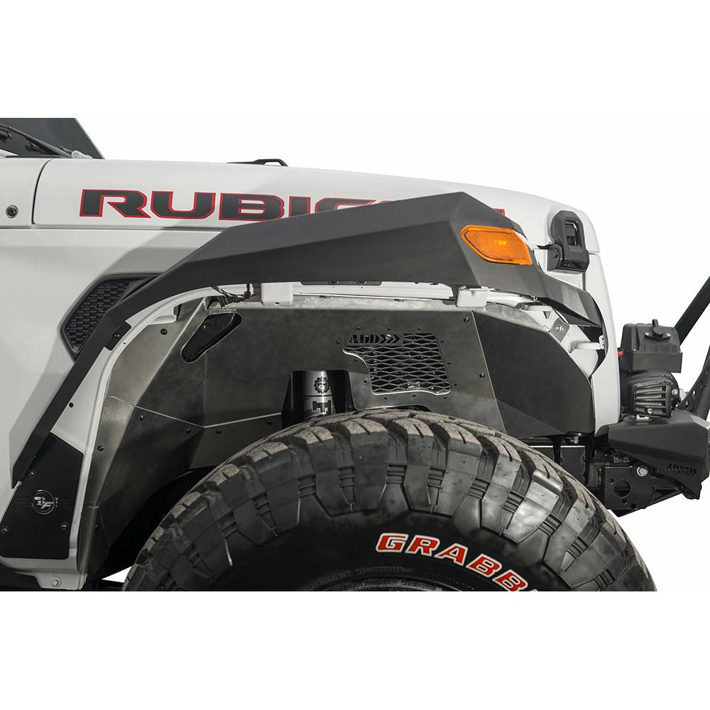 Beef up your wheel wells and gain functionality with the ADD rock fighter inner fender liners. These liners pair perfectly with rock fighter fenders but can also be used with OEM fenders. The low-profile construction allows the use of 37" tires with aftermarket fenders or modified OEM fenders. The fully bolt-on design lets you get the most out of your jeep wrangler JL with ease. As always, this product is made in America.