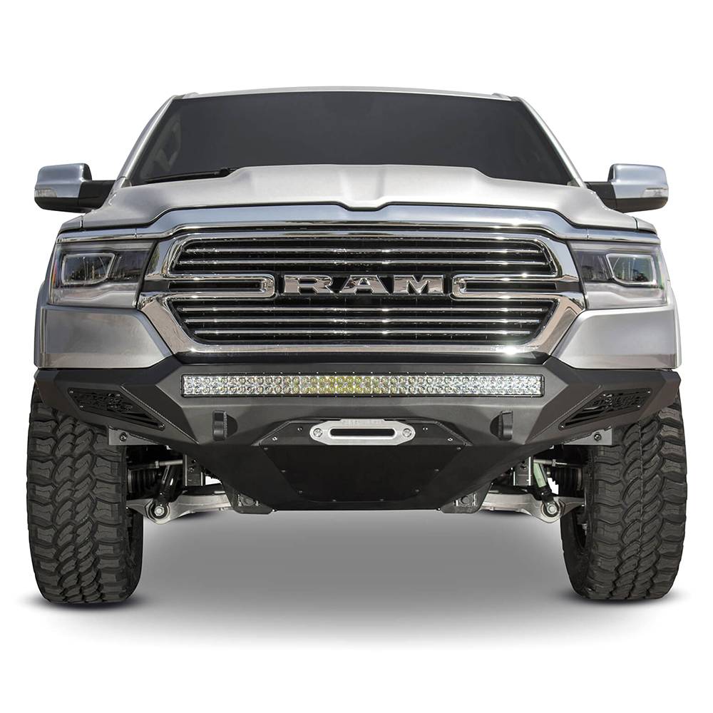 The dodge ram 1500 has never looked better with the stealth fighter front bumper. A radius steel plate design gives your ram 1500 truck added front end protection without all the extra bulk. Matching the ram 1500 factory body lines, the stealth fighter front bumper is a tight fitting steel plate bumper that compliments the ram look. Patented universal light mount system allows mounting up to a 40" radius LED or 10 cube lights. Mount any combination of brand, size and style light to give your dodge ram front bumper the added lighting that you need. Fully bolt-on means there is no cutting or welding required to install the stealth fighter front bumper. Reinforced D-ring mounts provide your truck with added utility to pull through any tough situation, while optional parking sensor cutouts retain your trucks OEM amenities. Comes packaged with universal light mount kit to install any brand and size lighting.