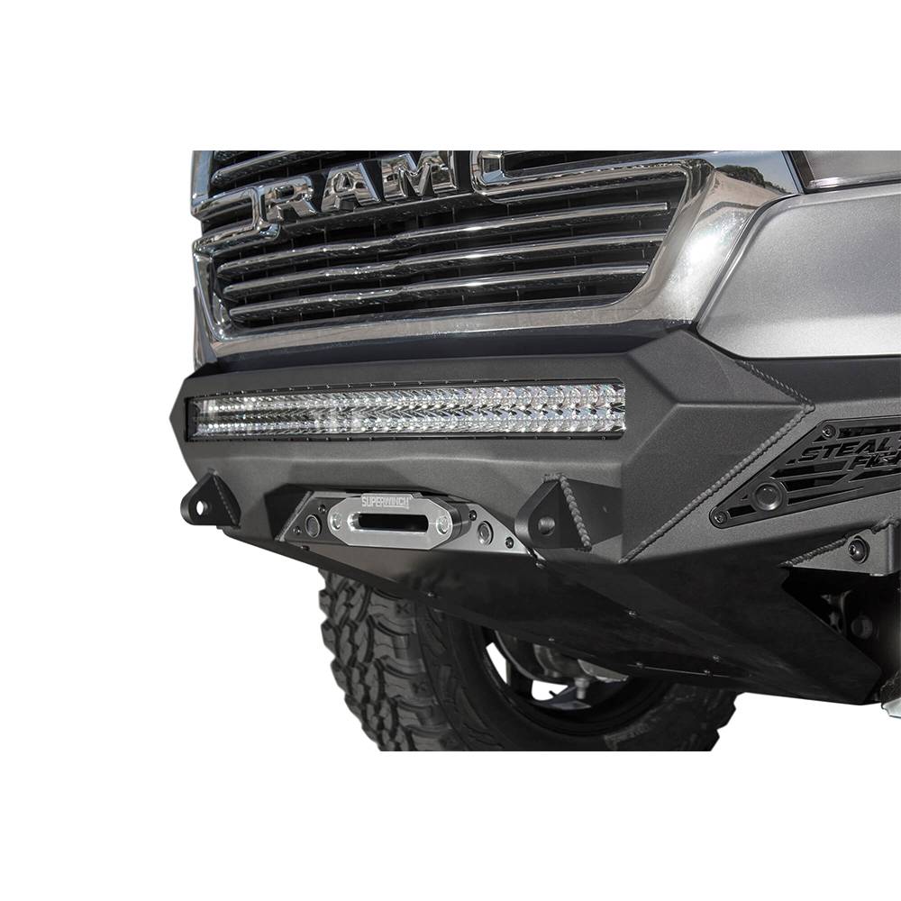 The dodge ram 1500 has never looked better with the stealth fighter front bumper. A radius steel plate design gives your ram 1500 truck added front end protection without all the extra bulk. Matching the ram 1500 factory body lines, the stealth fighter front bumper is a tight fitting steel plate bumper that compliments the ram look. Patented universal light mount system allows mounting up to a 40" radius LED or 10 cube lights. Mount any combination of brand, size and style light to give your dodge ram front bumper the added lighting that you need. Fully bolt-on means there is no cutting or welding required to install the stealth fighter front bumper. Reinforced D-ring mounts provide your truck with added utility to pull through any tough situation, while optional parking sensor cutouts retain your trucks OEM amenities. Comes packaged with universal light mount kit to install any brand and size lighting.