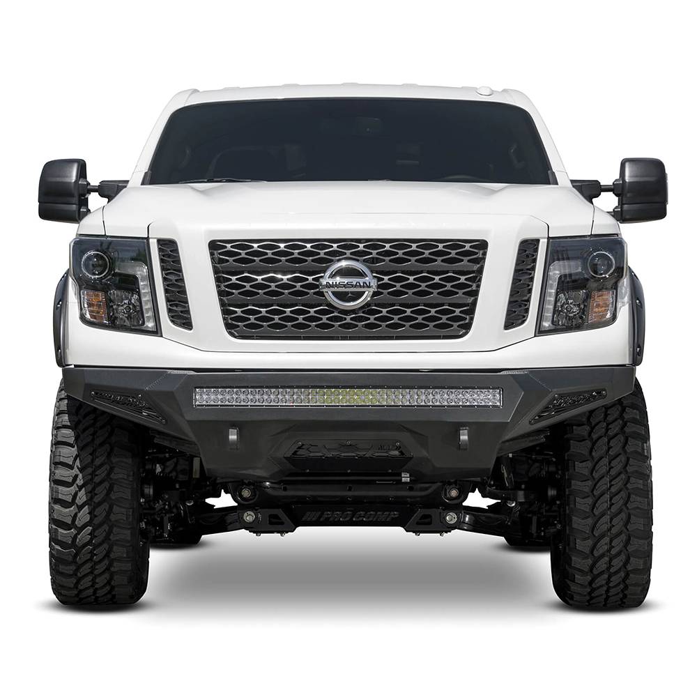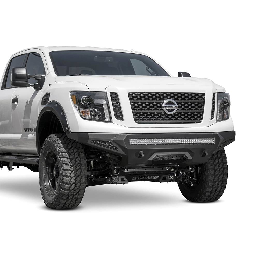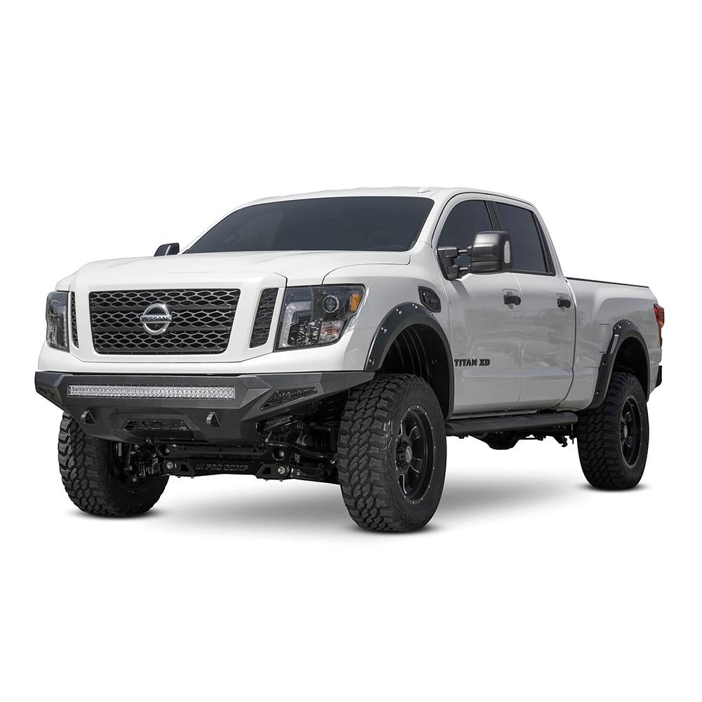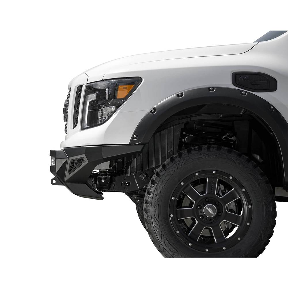 ADD stealth fighter front bumper for the Nissan titan XD is one of best fitting and most aggressive looking bumpers on the market. A modern radius plate design allows the stealth fighter to keep a tight fit around the front of the titan XD to match the factory design, while providing added protection with patented universal light mount system up to 10 cube lights or a 40" radius LED bar can be mounted into the center of the bumper. Additional lighting is available with two 10" SR light bar mounts behind the side panels. Reinforced clevis mounts allow the use of a 3/4" D-ring for added utility. And the stealth fighter front bumper retains the titan XDs front parking sensors to keep the OEM features.
