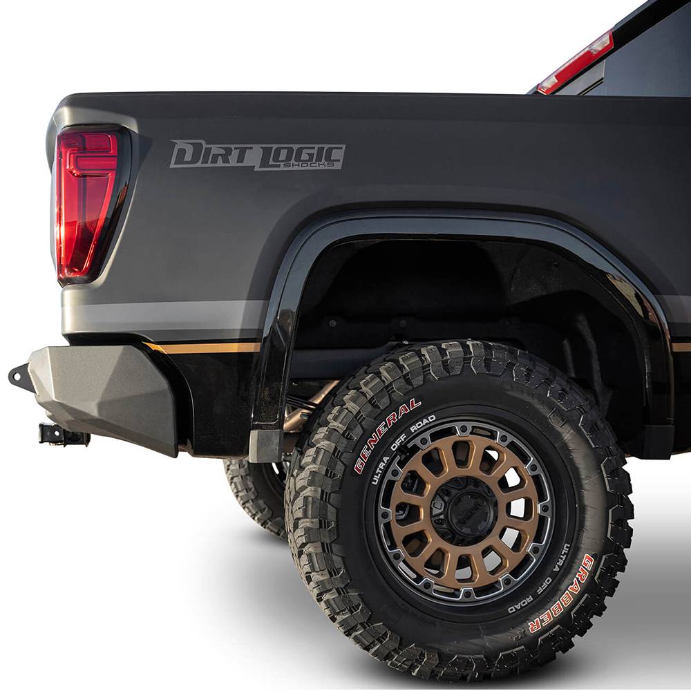 Note: Chevy/GMC 1500 Stealth Fighter Rear Bumper NO SENSORS, NO BLIND SPOT, NO EXHAUST TIPS set up for Duallys and D-Ring Clevis Mounts in Hammer Black with Satin Black Panels