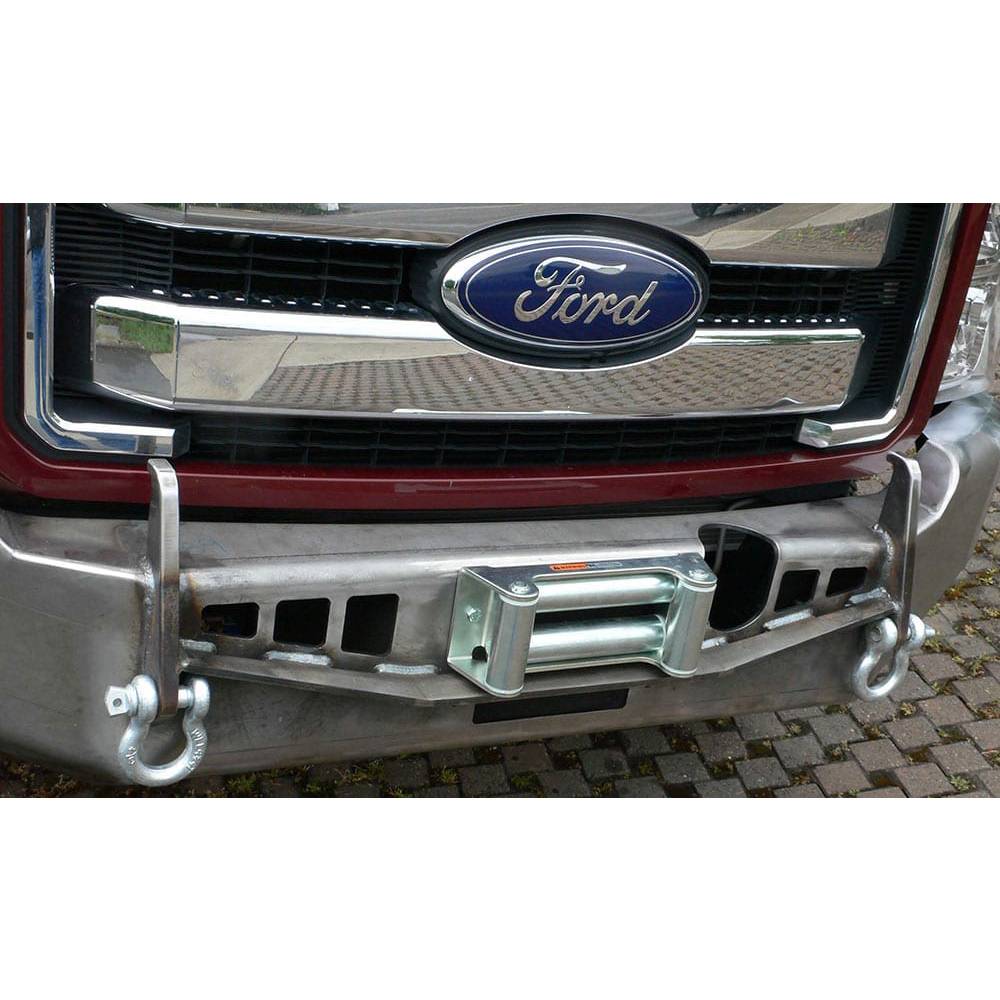 Fully mig-welded heavy duty 1/4" steel sub-frame and winch mount, 3/16" outer construction, shackle mounts, and standard light openings. Designed for any planetary gear winch including Warn 16.5ti. Super high approach angle, absolute minimum protrusion out front, houses a Warn 16,500lb or M12,000 winch installed upside down with the fairlead on top, recovery rings and horns, able to crush rocks, and leap tall buildings. The bumper will take a brand new Superduty diesel through some of the most rough terrain imaginable.