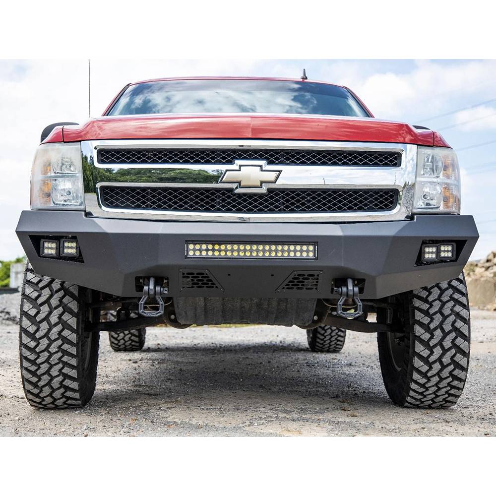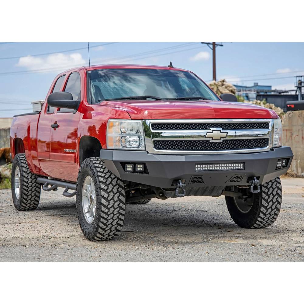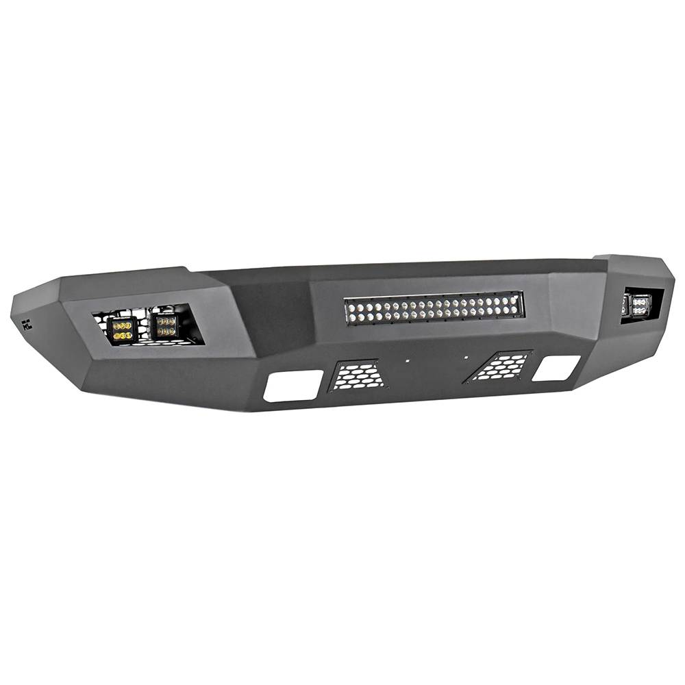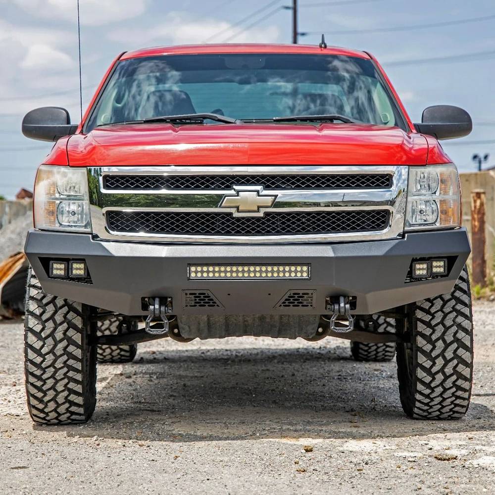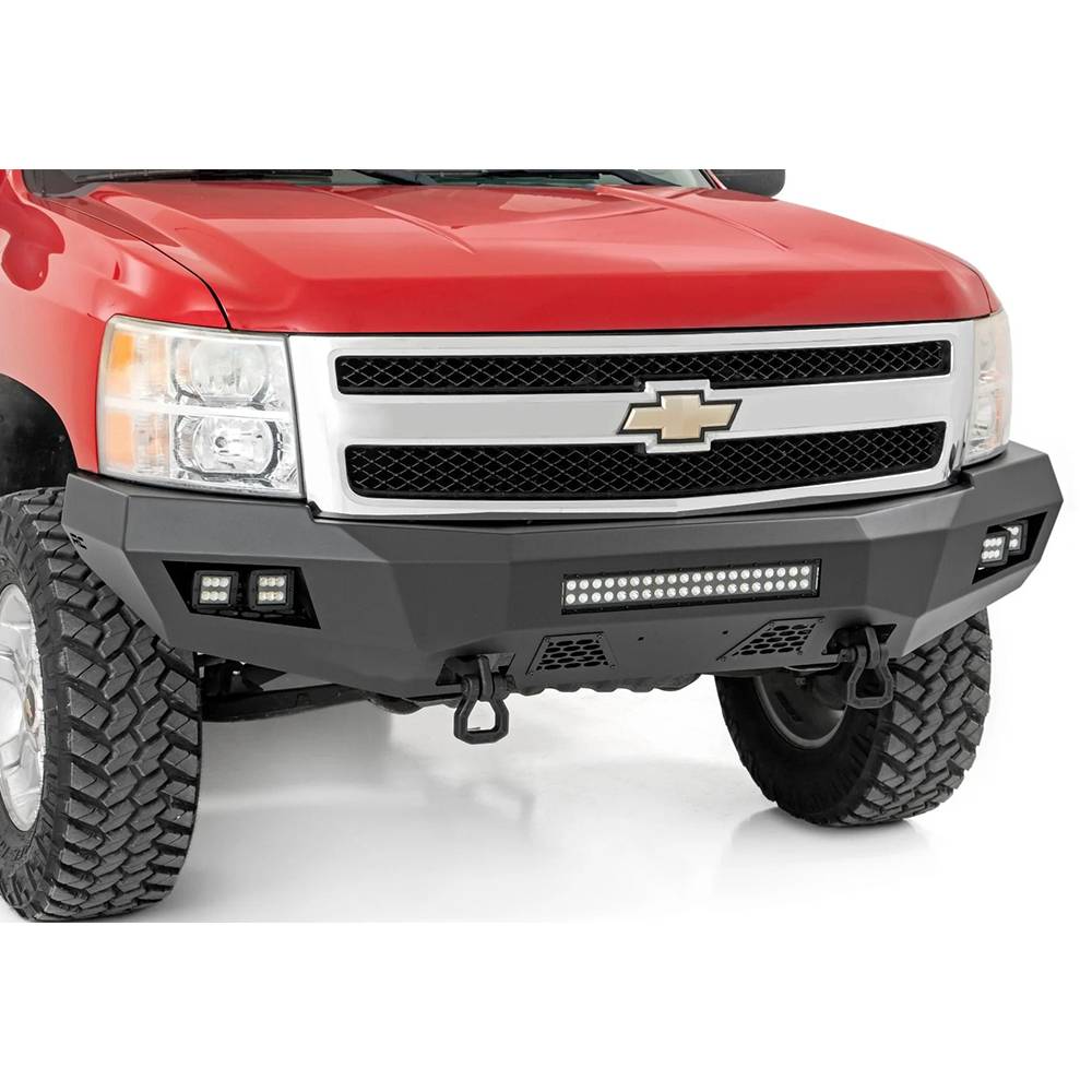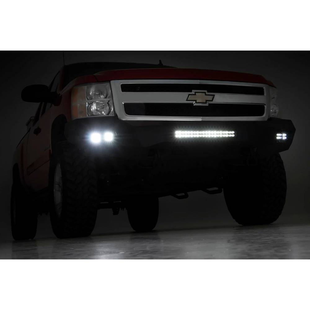 Front of your Chevrolet Silverado an aggressive, new appearance with Rough Country front LED bumper. This easy to install upgrade gives your truck an improved look and better protection that offer impressive off-road illumination. Rough Country front LED bumper is made of a durable, all-steel construction. Each bumper features four Rough Country 2" LED cubes and a 20" LED light bar that offer over 15,000 lumens of combined lighting power. Each bumper also includes sensor relocators to allow you to retain the vehicles anti-collision system. This incredible front bumper system is powder coated flat black and is ready to withstand the elements for a long lifespan of good looks. Rough Country front LED bumper is also easy to install with no cutting or drilling required.