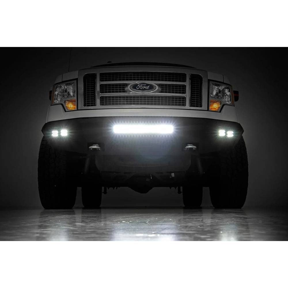 The front of your F150 an aggressive, new appearance with Rough Country front LED bumper. This easy to install upgrade gives your truck an improved look and better protection, with a dual set of 2" LED Cubes and a 20" LED light bar that offer impressive off-road illumination. Rough Country front LED bumper is made of a durable, all-steel construction thats ready to handle whatever you dish out. Each bumper features four Rough Country black series 2" LED cubes and a 20" LED light bar that offer over 15,000 lumens of combined lighting power. This incredible front bumper system is powder coated flat black and is ready to withstand the elements for a long lifespan of good looks.