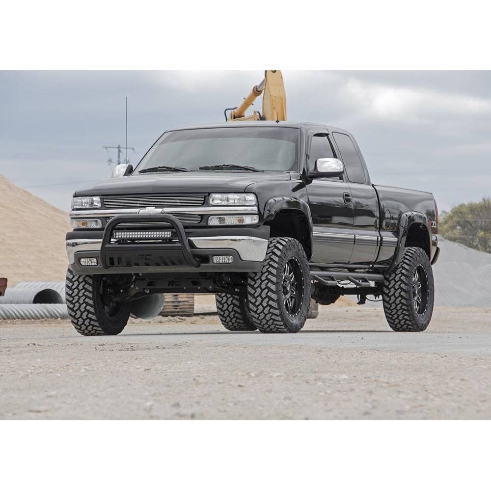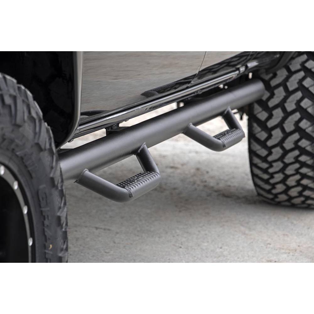 Rough Country new Wheel to Wheel nerf steps provide unrelenting style and easier access to your truck. These steps extend from one wheel well opening to the next, offering a clean install that lends to the look of your lifted truck. These steps can be installed on any vehicle, with or without a body lift. Innovative design actually hides any exposed frame you see under the truck, offering extra protection for your rocker panels. Rough Country nerf steps are made out of ultra-durable .084 wall corrosion resistant tubing with a zinc base coat and black finish for a sharp look that ready to withstand the elements. Rough Country steps include a lifetime replacement warranty.
