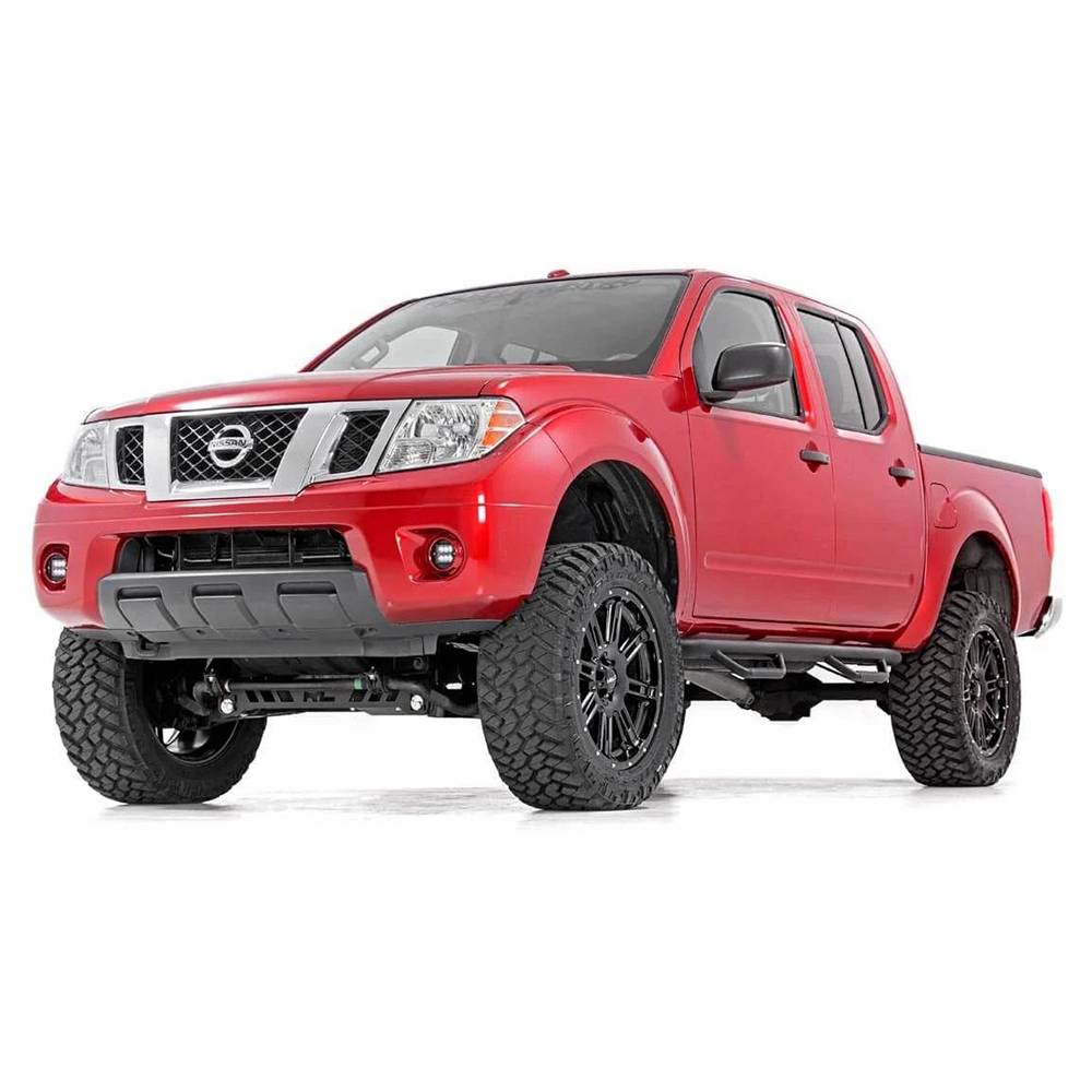 Rough Country cab length nerf steps provide unrelenting style and easier access to your truck. These steps extend the span of the cab offering a clean install that lends to the look of your lifted truck. Rough Country Nissan frontier nerf steps feature a large, 3" diameter tubing that compliments the vehicle design considerably better than smaller 2" bars while offering greater durability. These steps can be installed on any vehicle, with or without a body lift. Innovative design actually hides any exposed frame you see under the truck, offering extra protection for your rocker panels. Rough Country nerf steps are made out of ultra-durable .084 wall corrosion resistant tubing with a zinc base coat and black finish for a sharp look that ready to withstand the elements. Rough Country steps include a lifetime replacement warranty.