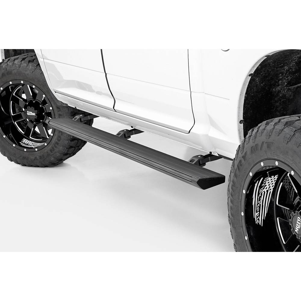 The retract electric running board steps offer you a sleek, modern way to climb into your cab. These durable electric side steps feature a motorized "swing-out" function that instantly extends the step when you open the door. The convenient drop profile allows for easy entry and works great on trucks from stock height to any size lift. Once the door closes, the step automatically tucks away for a clean look. Rough Country retractable truck steps feature an easy "Plug and Play" assembly, connecting directly to your battery terminal and OBDII port for easy installation without the need for complicated wiring. With a durable aluminum construction and corrosion-resistant finish, these automated truck steps are designed for a long operational lifespan no matter where the road takes you.