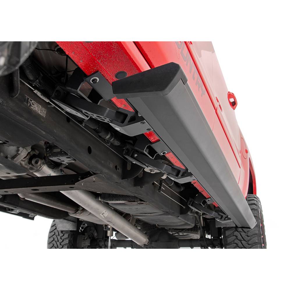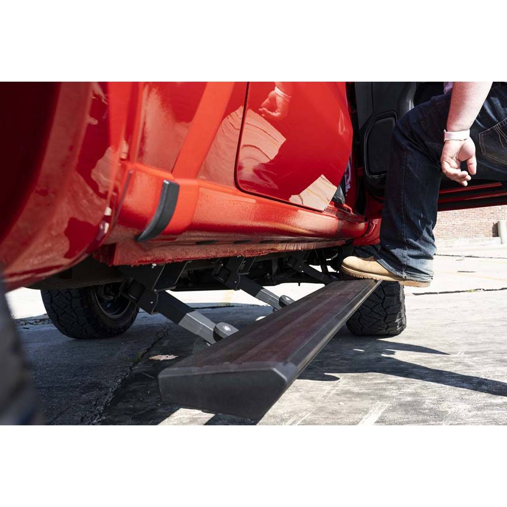 The retract electric running board steps offer you a sleek, modern way to climb into your cab. These durable electric side steps feature a motorized "swing-out" function that instantly extends the step when you open the door. The convenient 6" drop profile allows for easy entry and works great on trucks from stock height to any size lift. Once the door closes, the step automatically tucks away for a clean look. Rough Country retractable truck steps feature an easy "Plug and Play" assembly, connecting directly to your battery terminal and OBDII port for easy installation without the need for complicated wiring. With a durable aluminum construction and corrosion-resistant finish, these automated truck steps are designed for a long operational lifespan no matter where the road takes you.