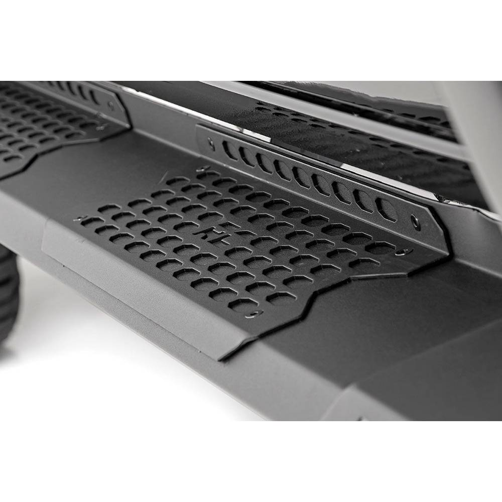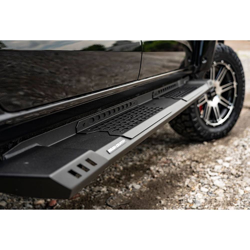 Swap out your skinny, factory running boards with Rough Country wider and more aggressive HD2 running boards. These beefy, cab-length running boards make it much easier to get in and out of your truck. With a durable all-steel construction and reinforced mounting solution, these running boards remain strong and sturdy through years of climbing into your cab. Each step features two non-skid plates with a stamped "RC" logo for good looks and easy entry. The "tech" style design gives your truck a unique look that's much more aggressive than factory steps, while the wider profile is perfect for proper footing and looks more proportional to the larger trucks of today.
